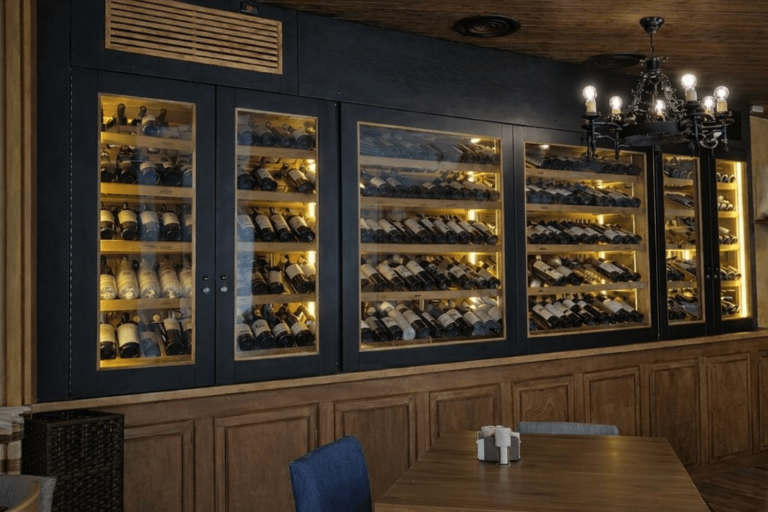 El proyecto se compone de dos bodegas independientes, diseñadas y fabricadas específicamente para adaptarse a distintas zonas del restaurante y a diferentes usos operativos. Por un lado, una bodega de corte bajo, situada sobre la repisa del comedor principal, con una altura aproximada de 1,30 metros, pensada para ofrecer visibilidad directa del vino al cliente y facilitar el servicio en sala. Por otro, una vinoteca de suelo a techo, ubicada en otra estancia del restaurante, concebida como un gran espacio de conservación y exposición, capaz de albergar una colección extensa y variada.