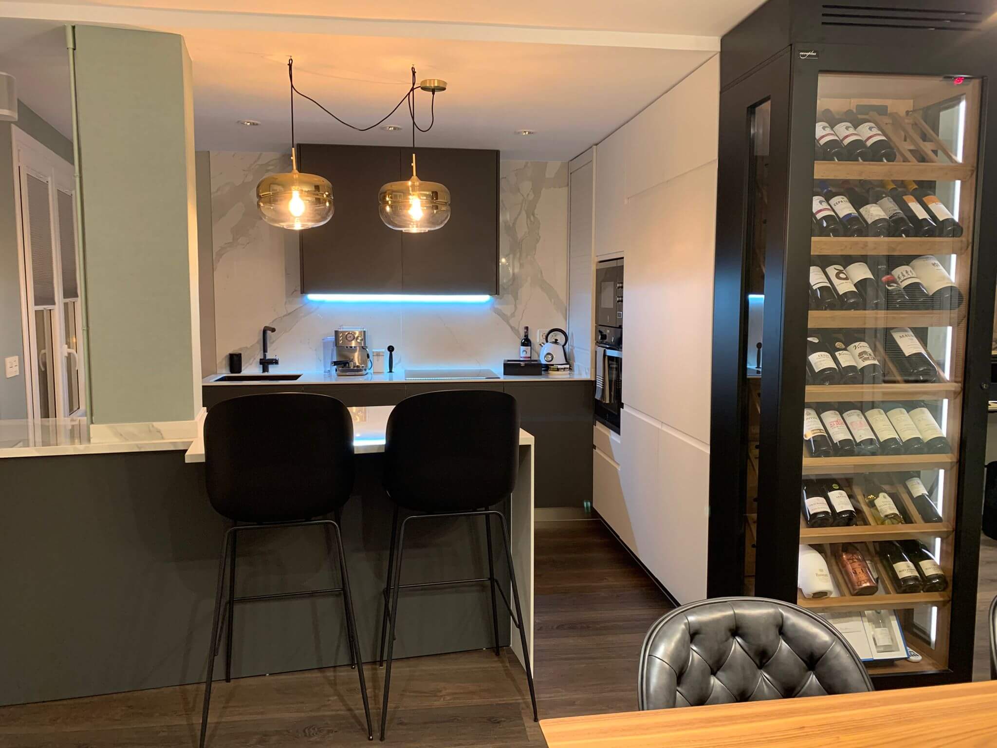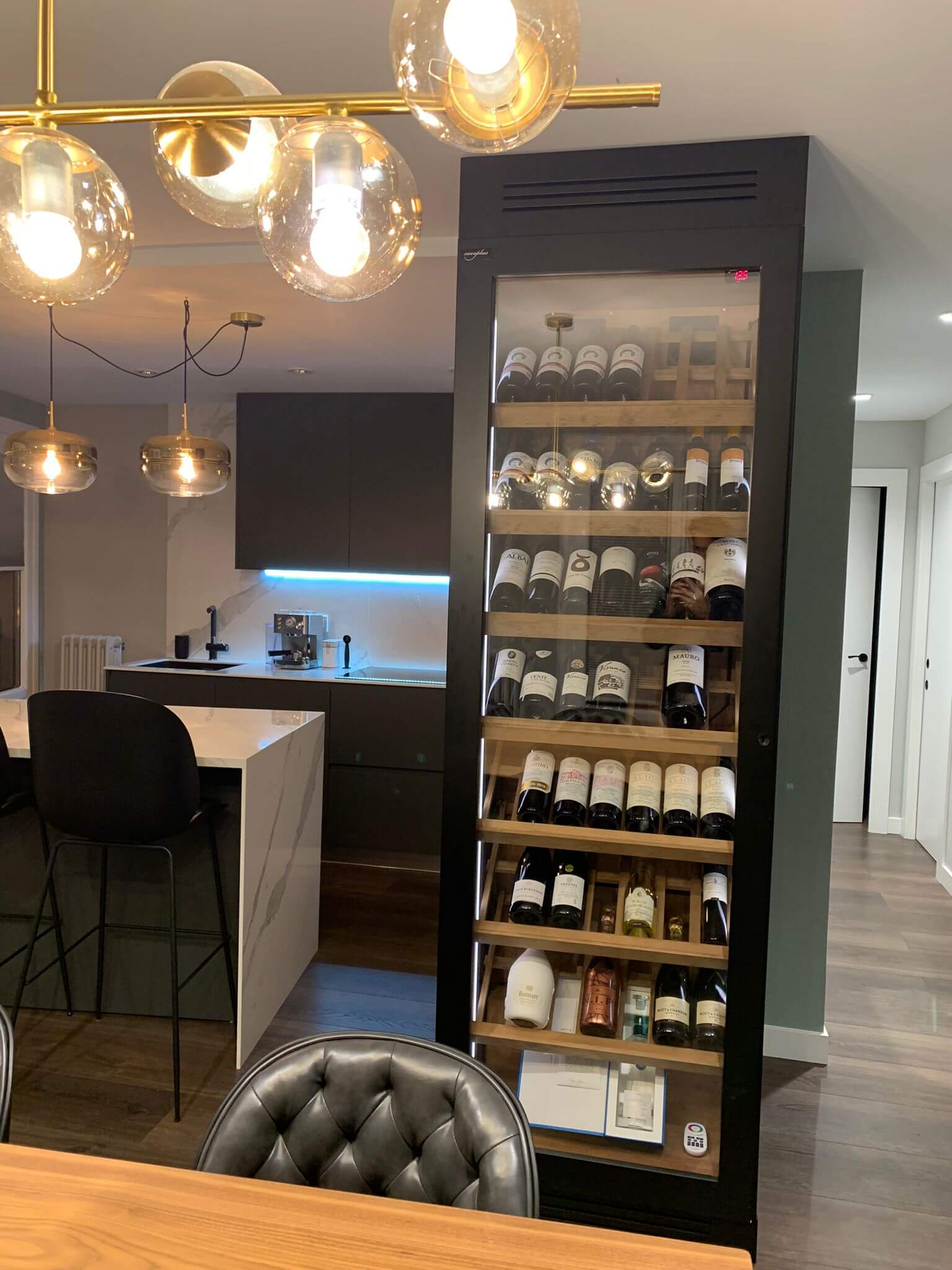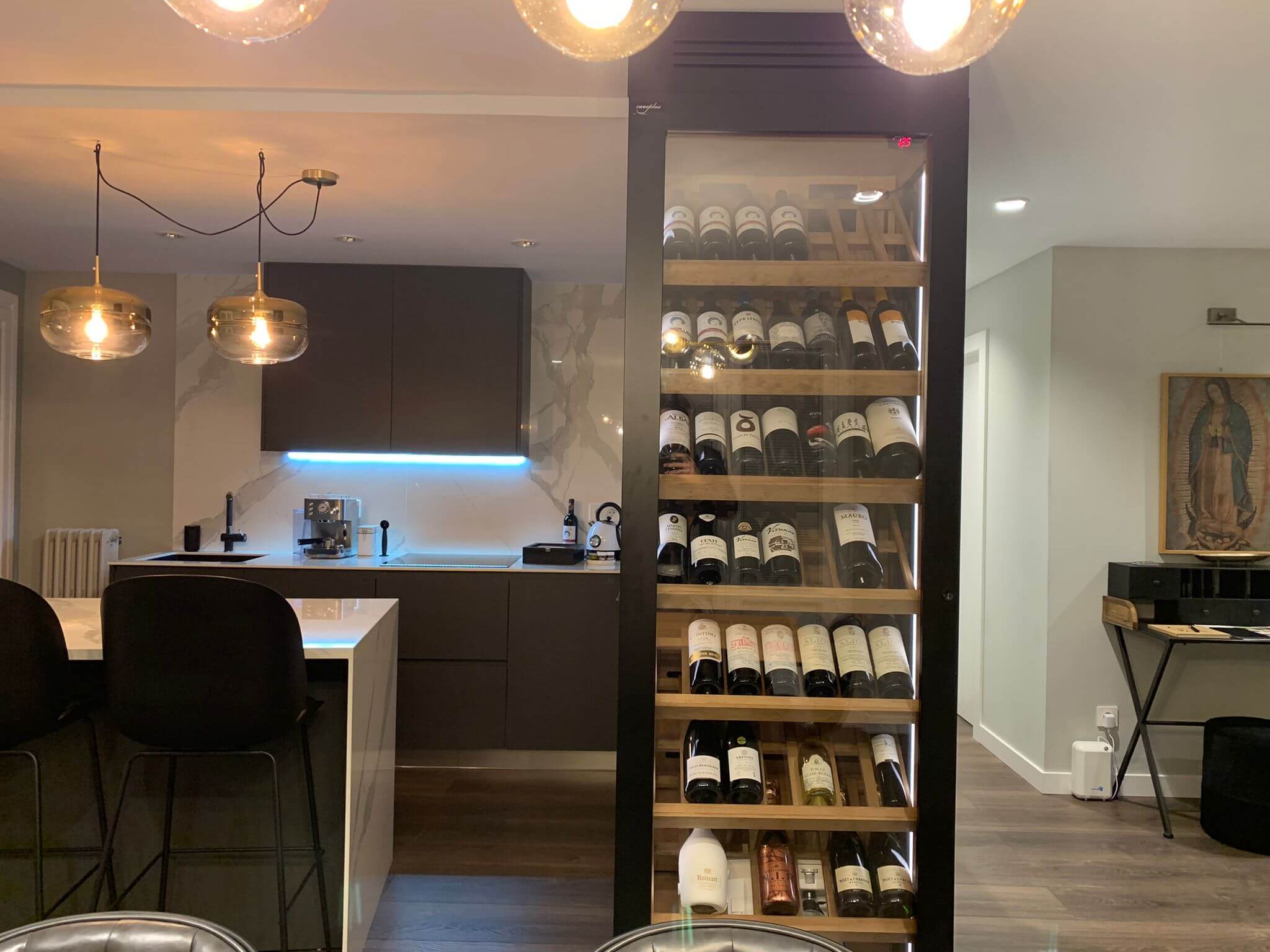 Vinoteca a Medida Burgos es mucho más que un sistema de conservación de vinos. Es una pieza con función también decorativa diseñada para integrarse en un concepto de salón–cocina abierto, donde el vino se convierte en protagonista y elemento divisor de espacios con elegancia y personalidad.