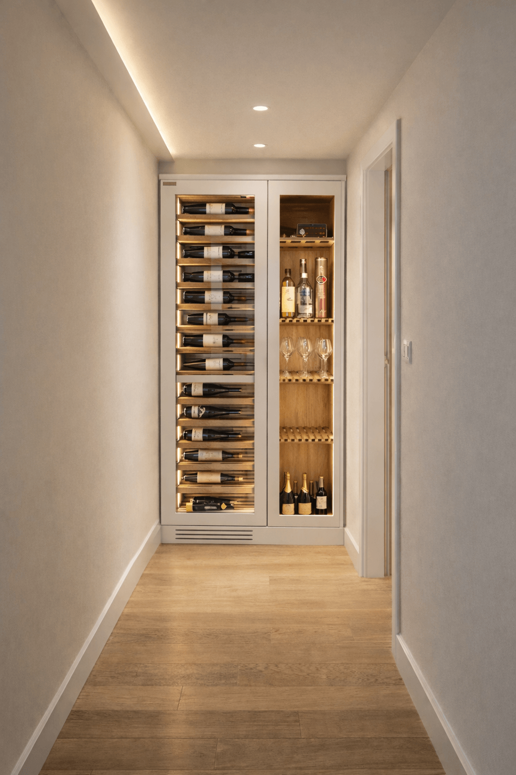 La iluminación LED en 3500K, regulable mediante mando a distancia, realza las vetas del roble interior y aporta una tonalidad equilibrada que no altera el vino ni la percepción cromática de las etiquetas. La luz se convierte en un elemento escenográfico que transforma la Vinoteca a Medida Burgos en una pieza decorativa viva dentro del salón.