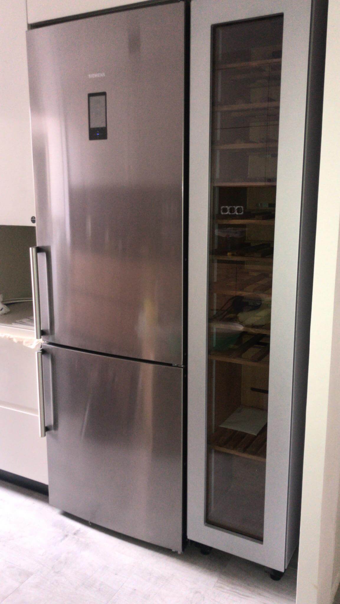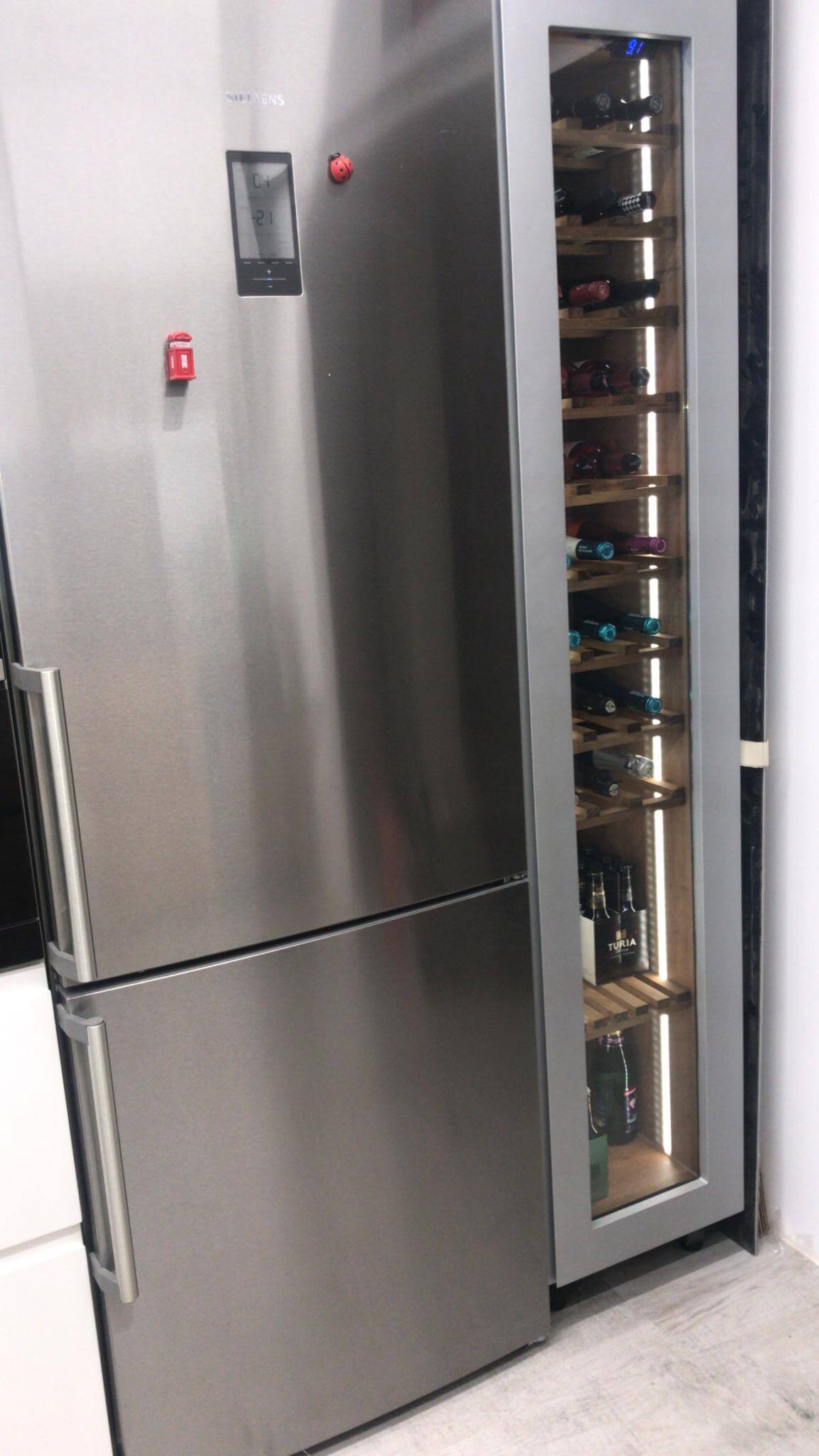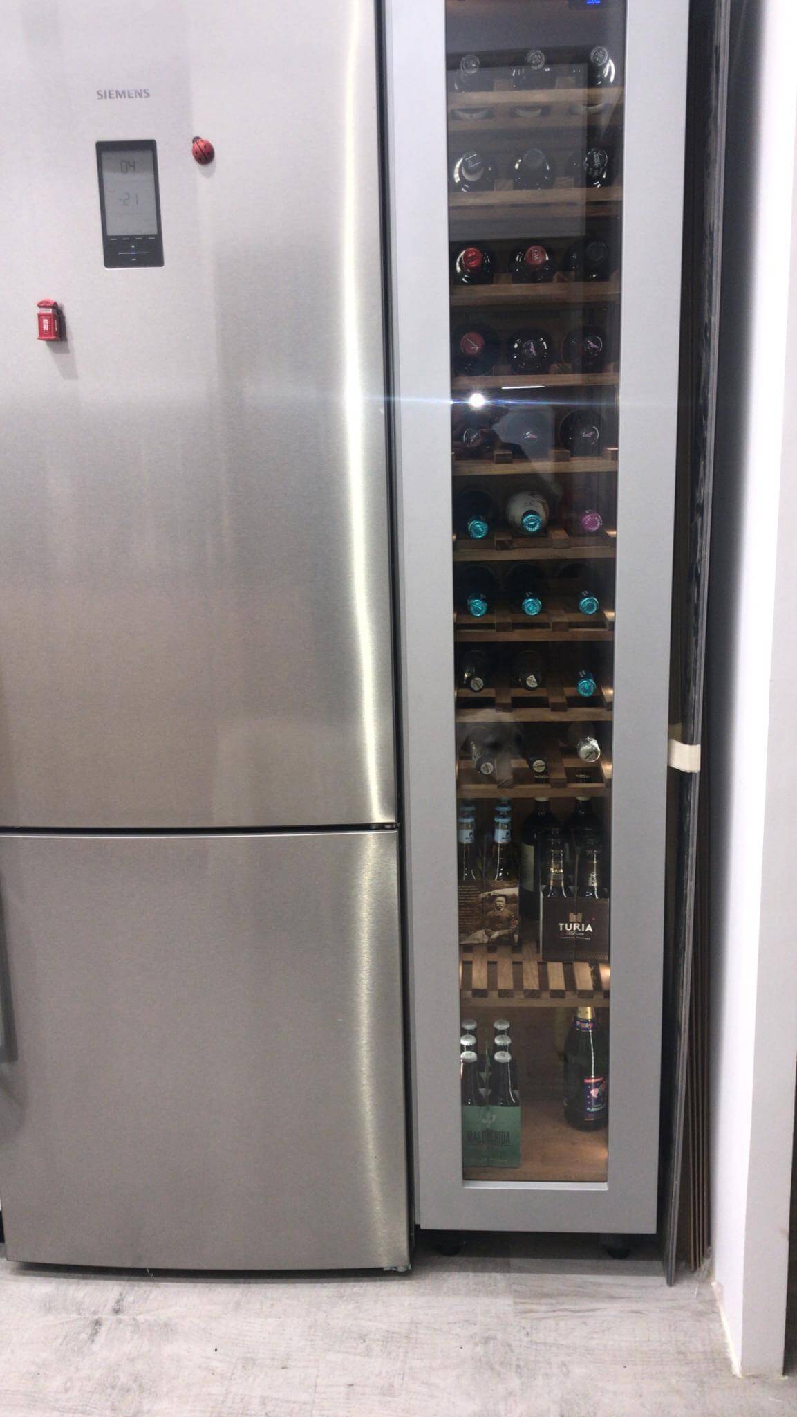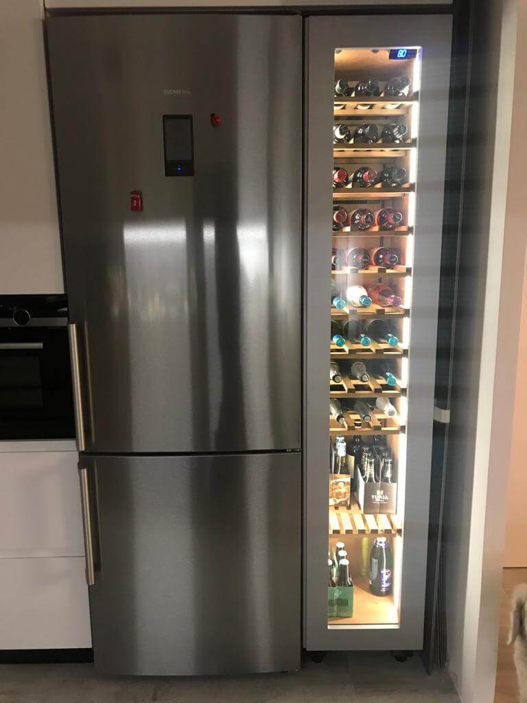 Encastrada la vinoteca junto al frigorífico, alineando cotas y jambas para que el frente resulte continuo. El marco en aluminio anodizado gris recoge una puerta acristalada con filtro UV que muestra el interior sin romper la limpieza del conjunto. El tirador es discreto e integrado, evitando herrajes visibles y reforzando el efecto de “columna”.