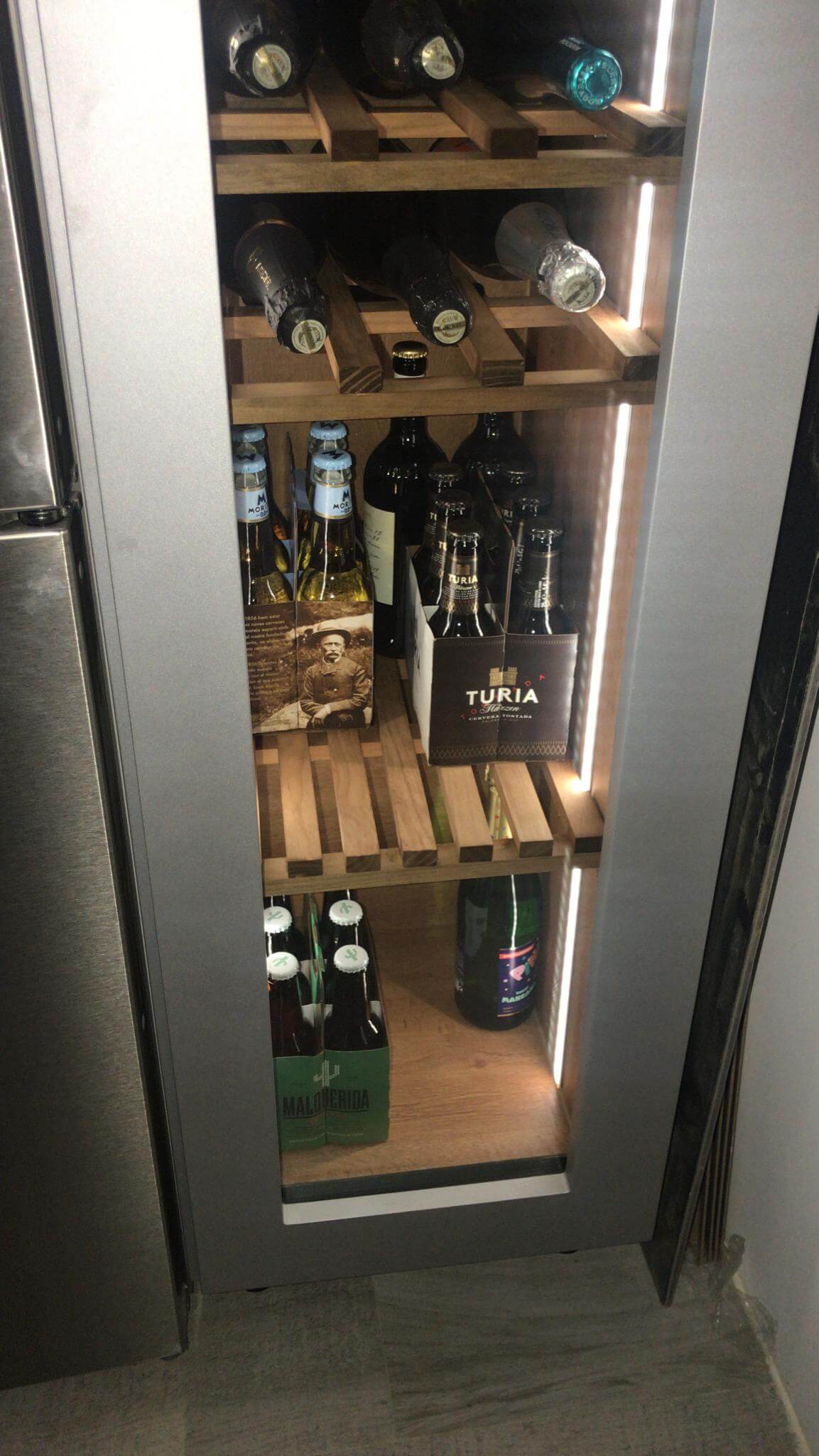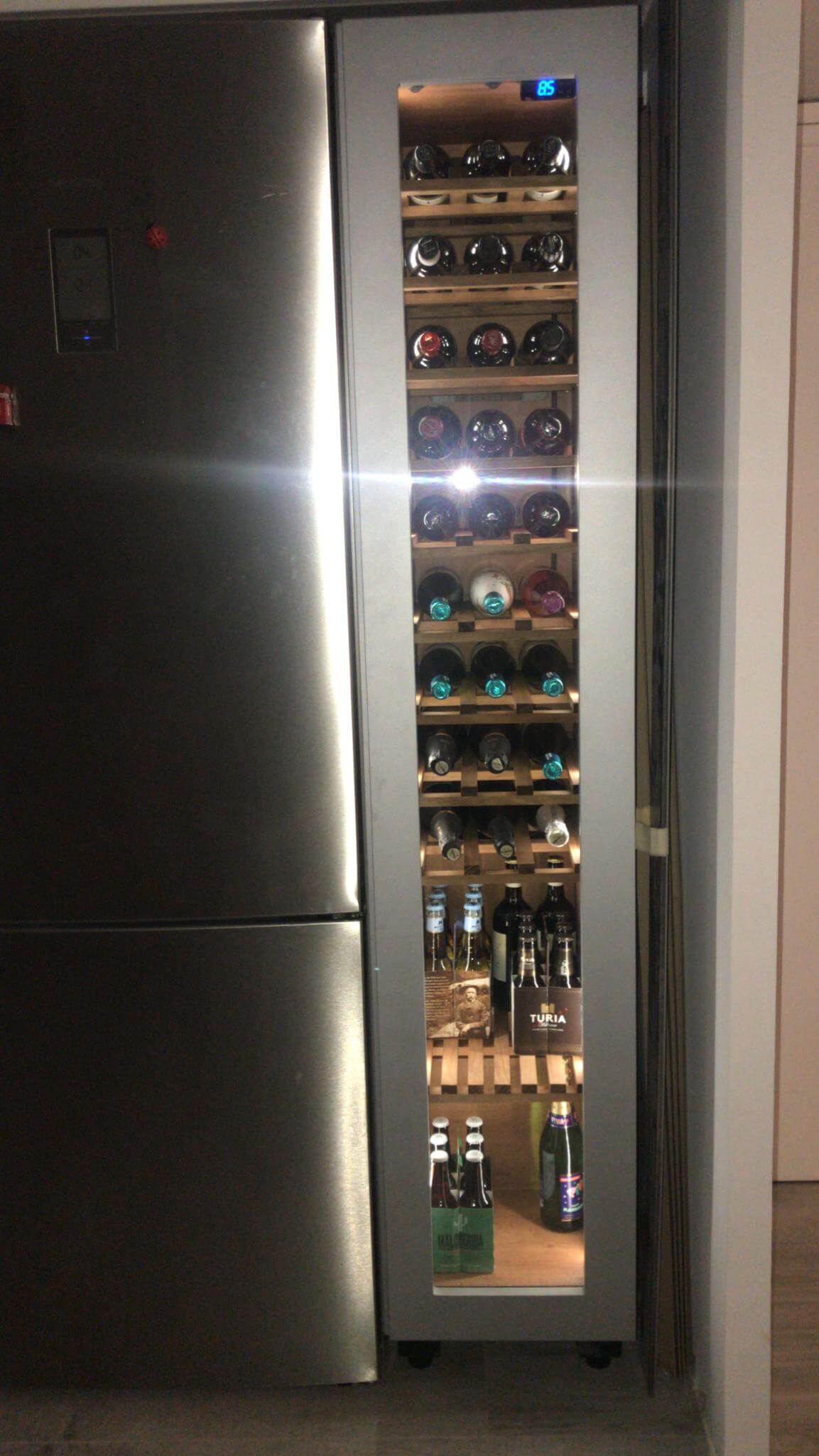 En el interior, configuradas las baldas de madera de veta clara, mecanizadas para alojar botellas en horizontal y permitir múltiples formatos. Una iluminación LED vertical en los laterales lava suavemente cada estante y aporta lectura inmediata del etiquetado sin deslumbrar. En la base, una zona polivalente admite refrescos y formatos altos, manteniendo la bodega útil para el día a día.