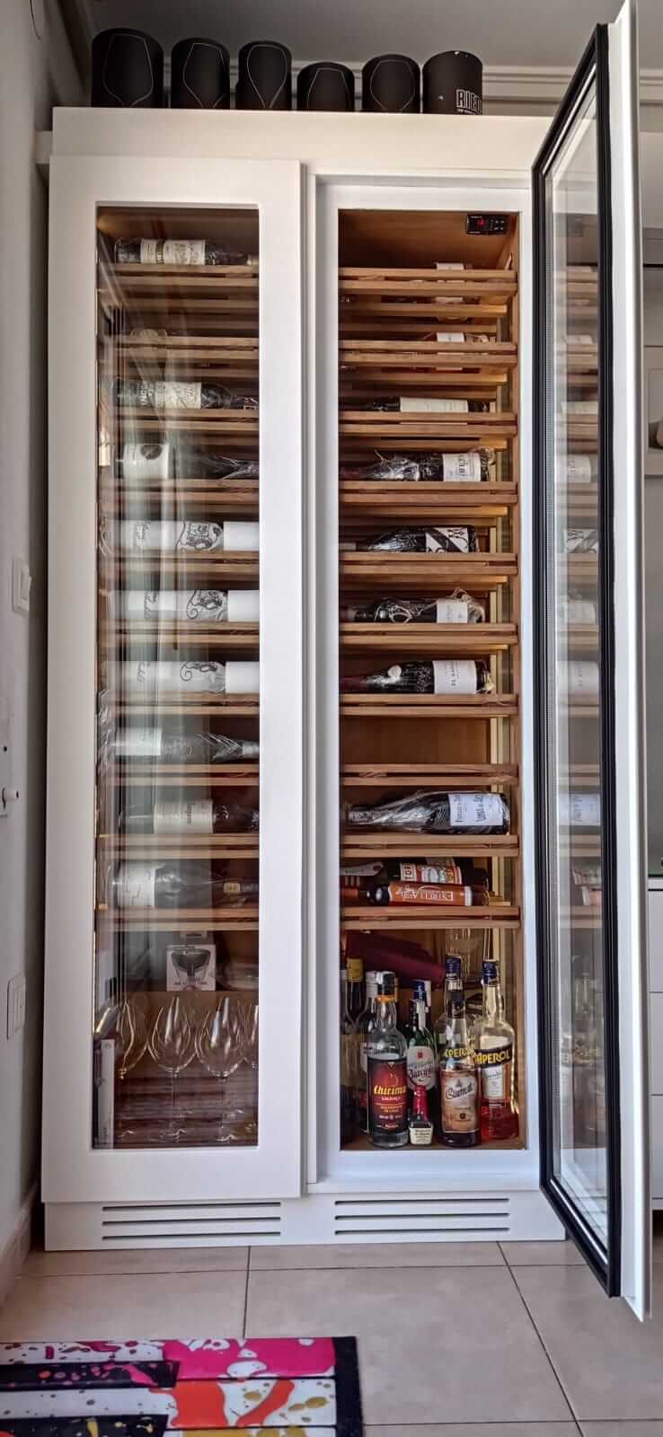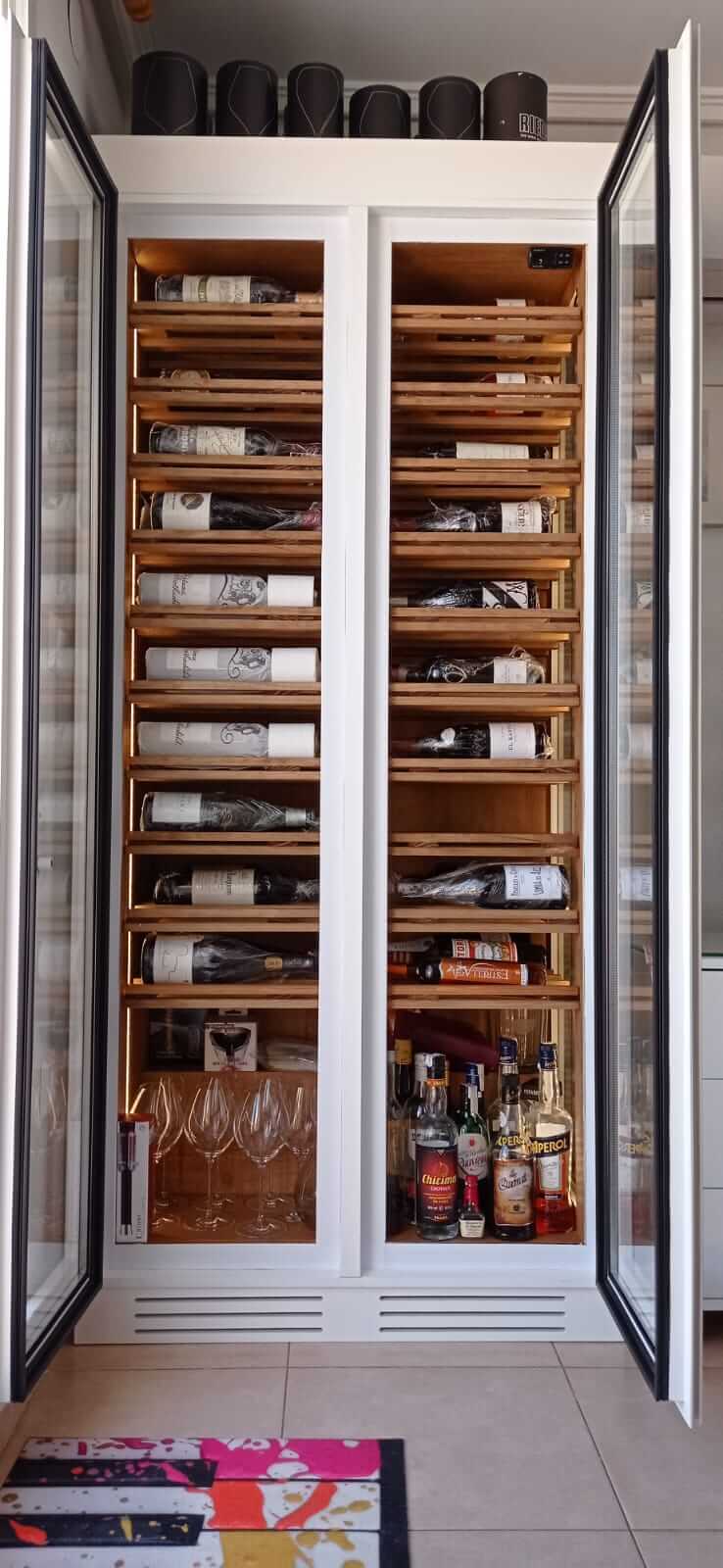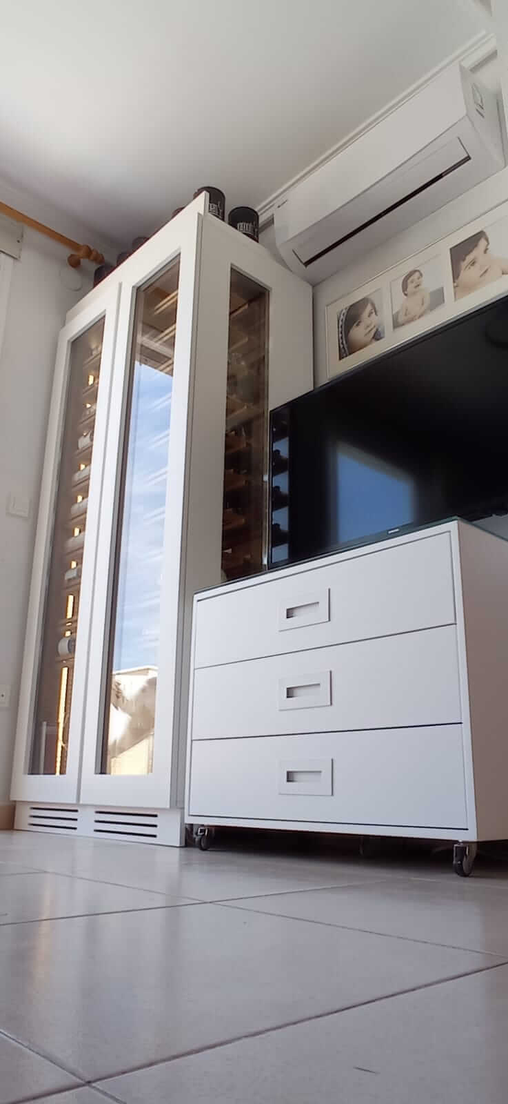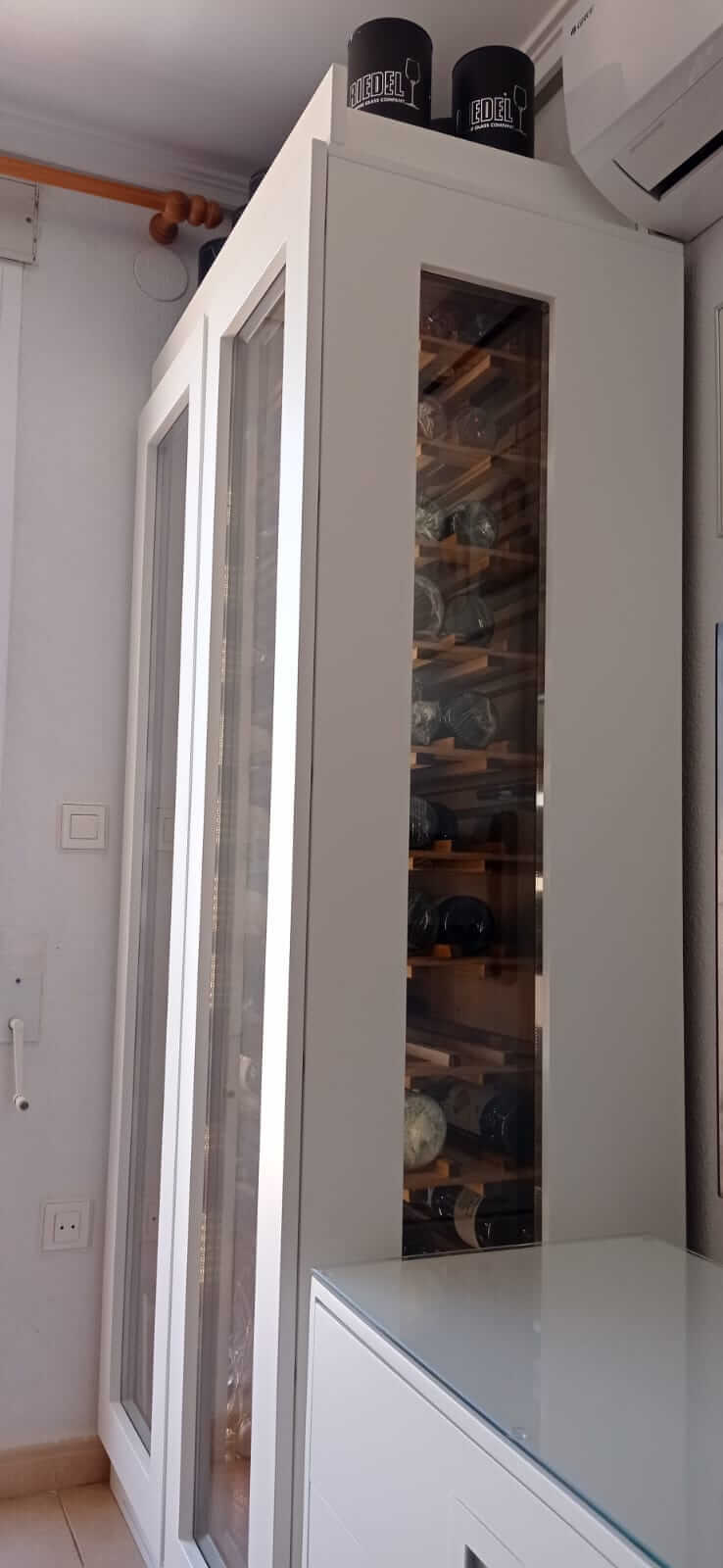 Este proyecto no es una vinoteca convencional, sino un mueble a medida de 1,90 metros de alto y 90 cm de ancho, lacado en blanco mate y concebido para almacenar botellas tumbadas con etiqueta vista. Se trata de una obra que conjuga estética, innovación y tradición, aportando a la vivienda un elemento que no solo cumple con la función de conservación del vino, sino que también refuerza el estilo decorativo del espacio.