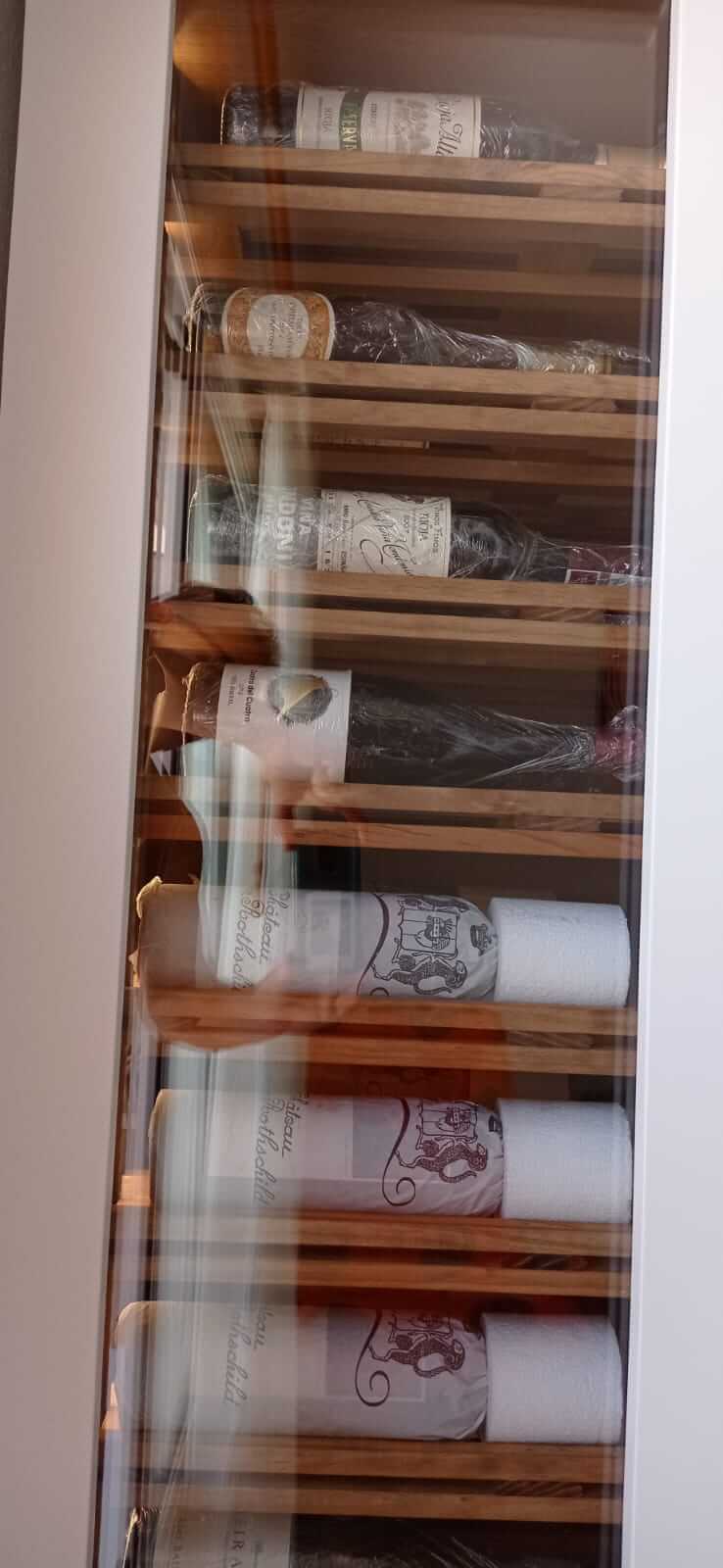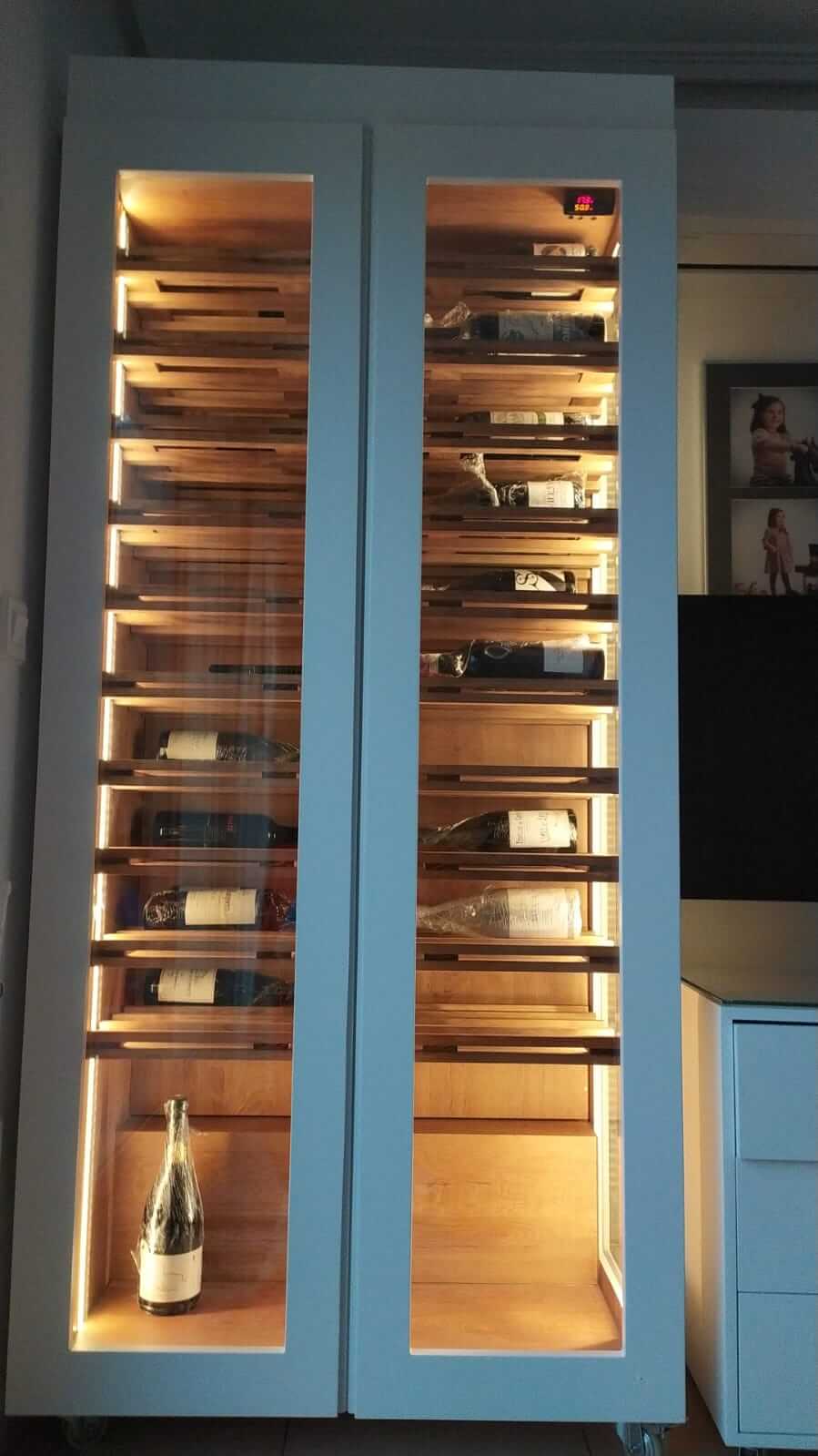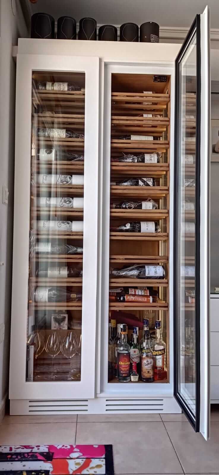 Este proyecto no es una vinoteca convencional, sino un mueble a medida de 1,90 metros de alto y 90 cm de ancho, lacado en blanco mate y concebido para almacenar botellas tumbadas con etiqueta vista. Se trata de una obra que conjuga estética, innovación y tradición, aportando a la vivienda un elemento que no solo cumple con la función de conservación del vino, sino que también refuerza el estilo decorativo del espacio.