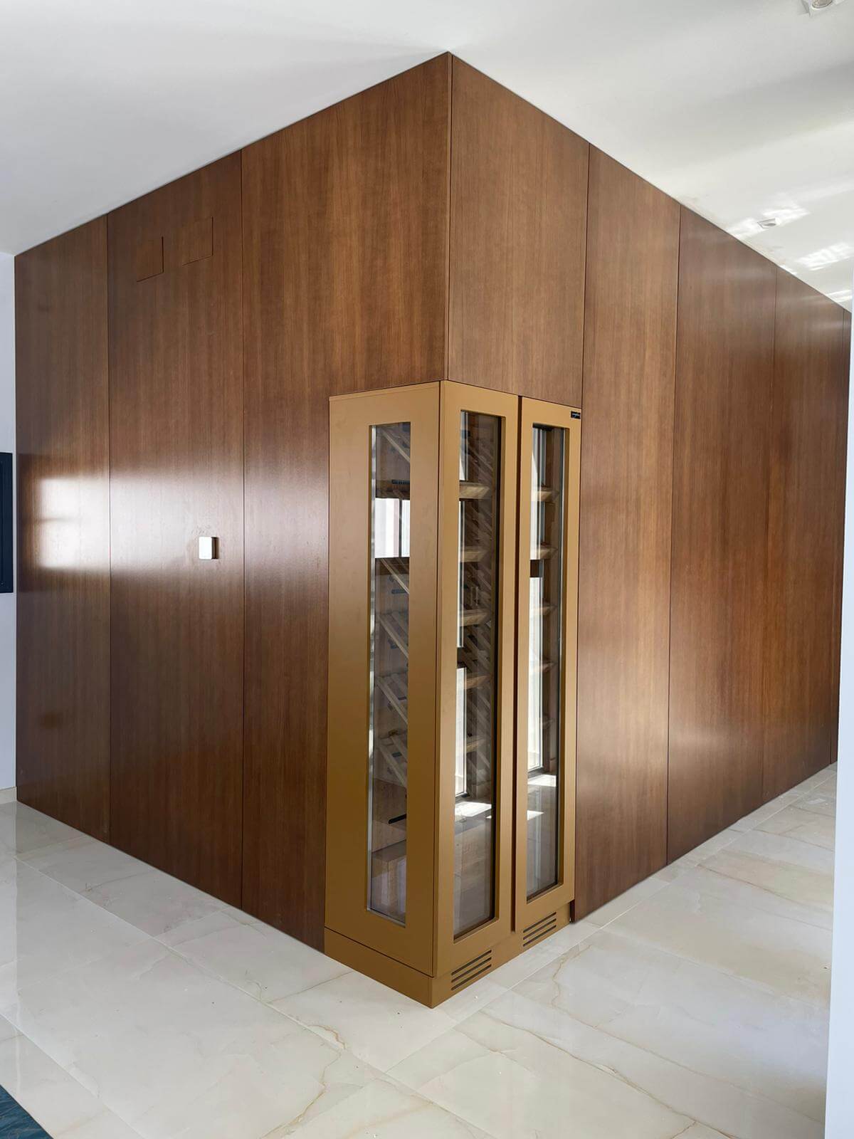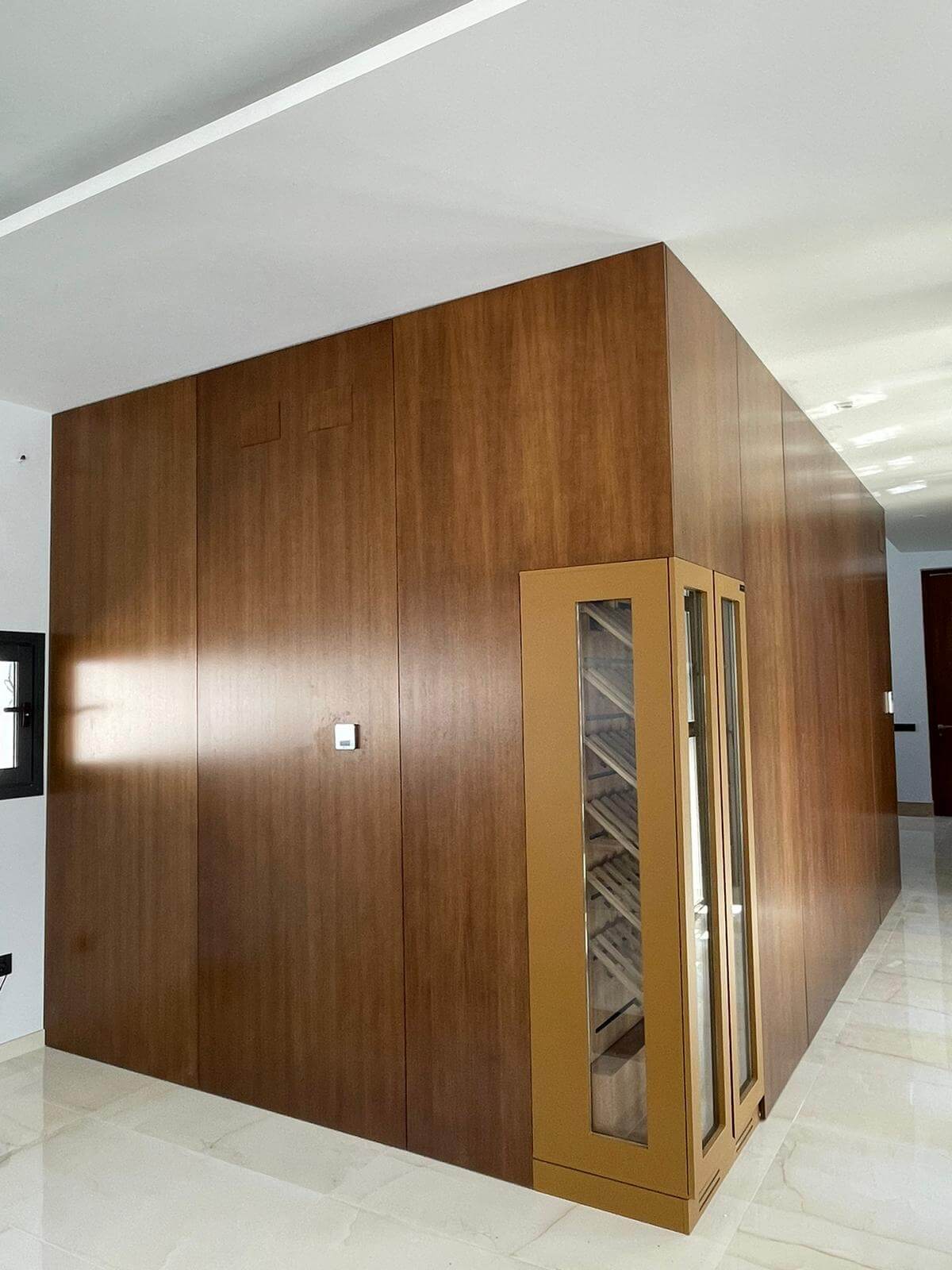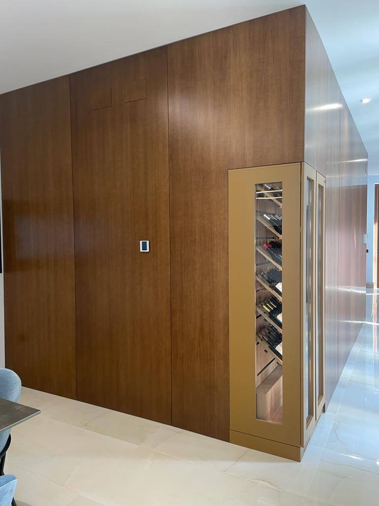 Vinoteca a dos caras, de doble puerta integrada en esquina de salón en vivienda Unifamiliar en Córdoba.