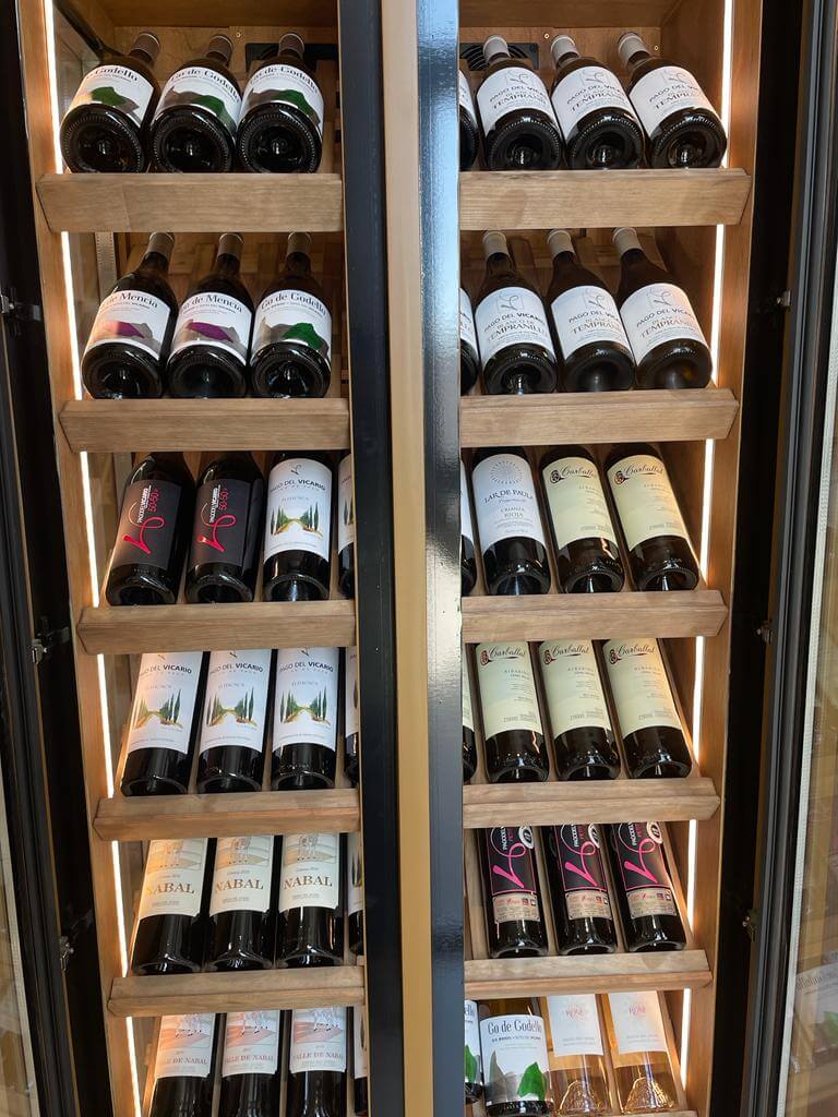 Bandejas de exposición para Vinos así como lateral izquierdo acristalado.