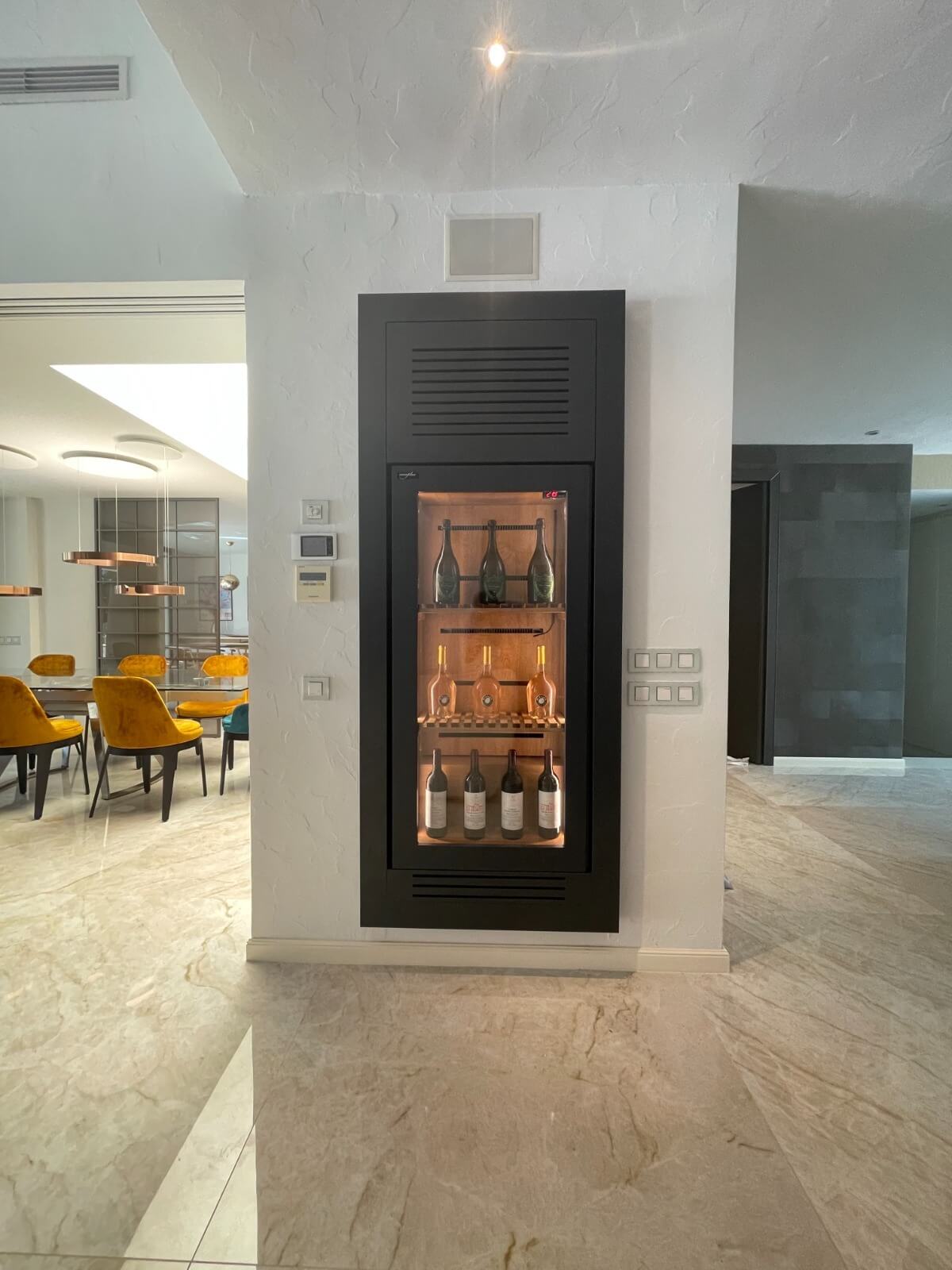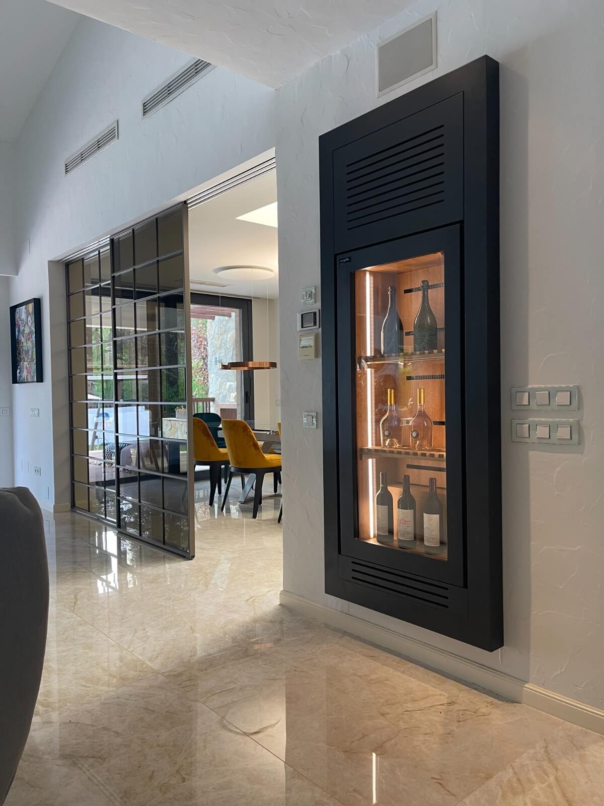 En una elegante vivienda unifamiliar de Burriana (Castellón), el diseño y la funcionalidad se funden en esta vinoteca a medida encastrada en salón, creada por Caveplus, el mejor fabricante artesanal de vinotecas a medida en España.