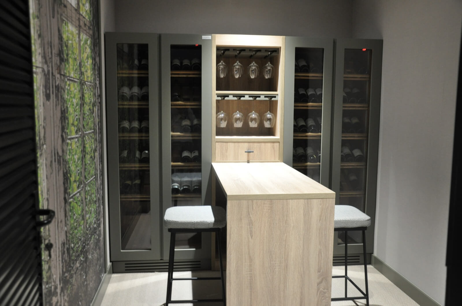 Los materiales utilizados en esta vinoteca a medida combinan la robustez de la madera con acabados sobrios en tonos grises, que aportan modernidad y elegancia sin renunciar a la calidez. Las puertas acristaladas permiten una visualización clara del contenido, y el sistema de refrigeración y aislamiento garantiza una conservación ideal para cada tipo de vino. Además, se han cuidado al máximo detalles como la ventilación, la accesibilidad y la ergonomía, aspectos fundamentales en un diseño de alto nivel.