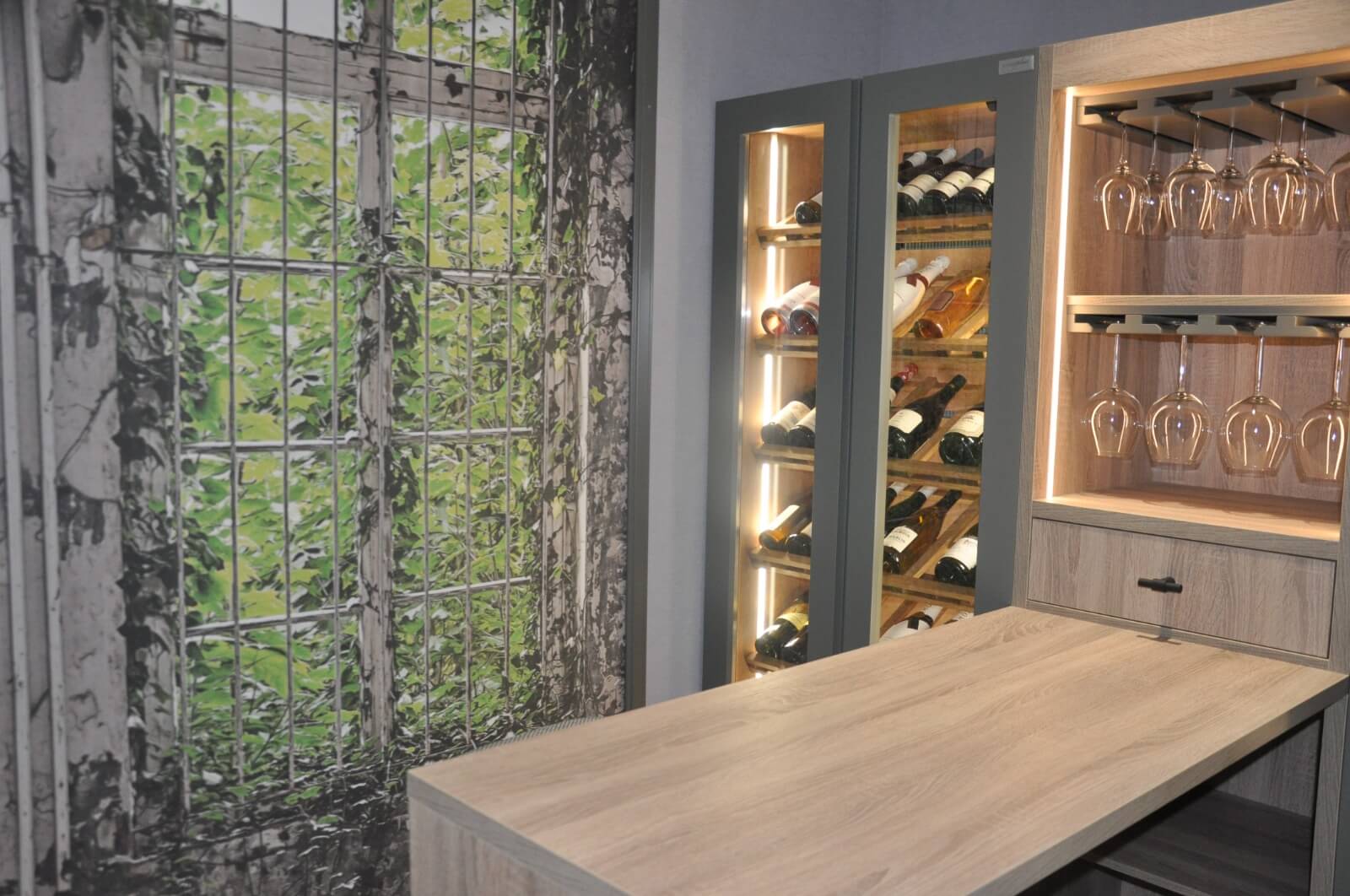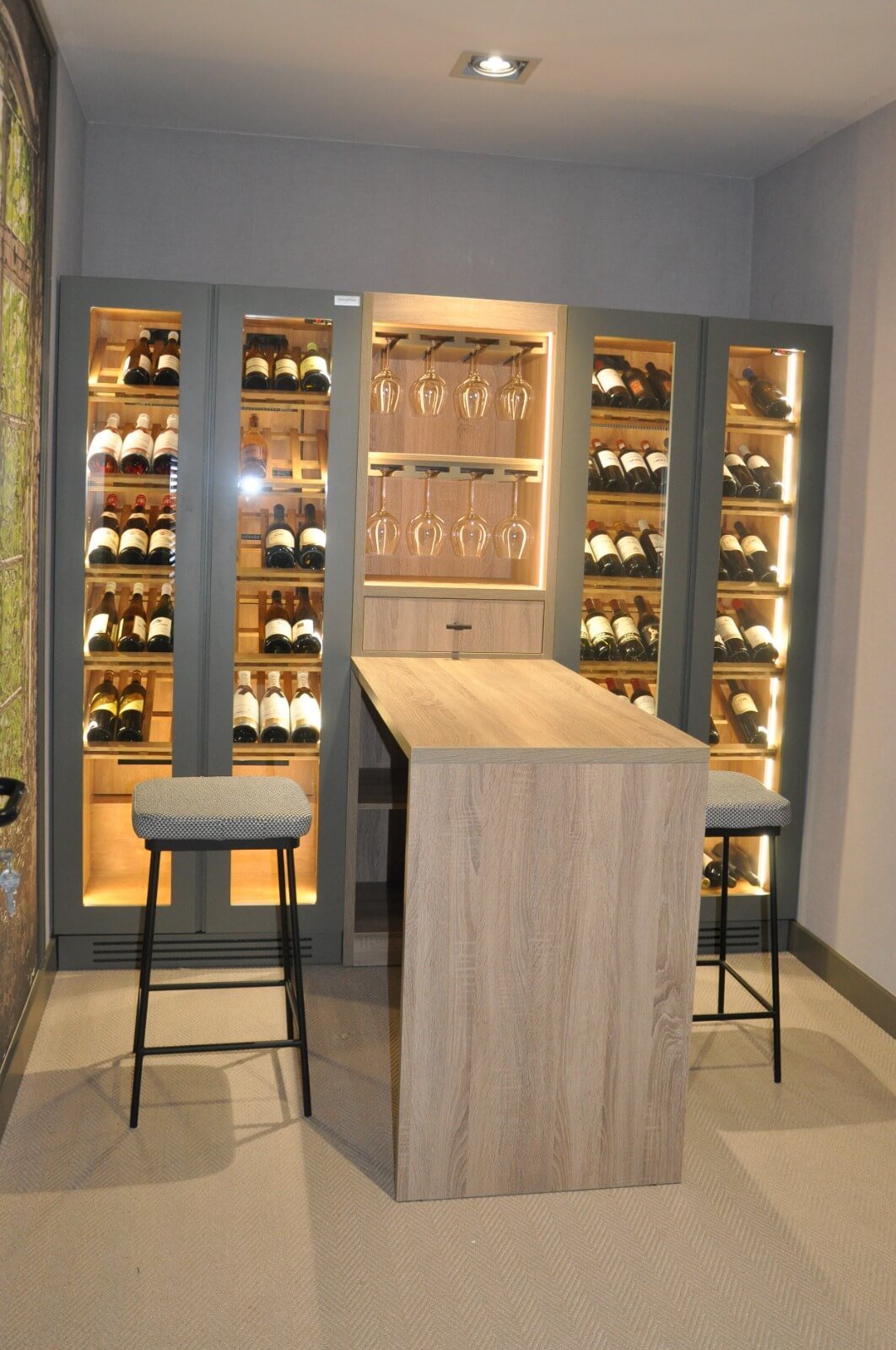 En el centro del diseño se ubica una zona pensada para la degustación: una barra en madera natural de roble claro, acompañada por dos taburetes tapizados de estilo moderno. Este espacio invita a compartir y disfrutar del vino en un entorno relajado y acogedor. Sobre la barra se encuentra un módulo central con estanterías para copas colgantes, perfectamente ordenadas y visibles gracias a la iluminación interior. Esta solución no solo es práctica, sino que añade un toque de distinción al conjunto.