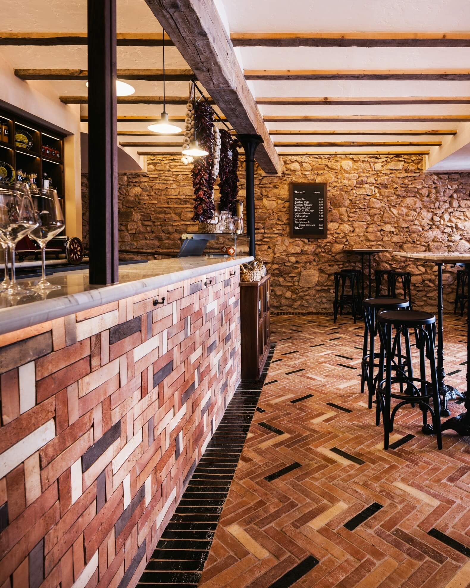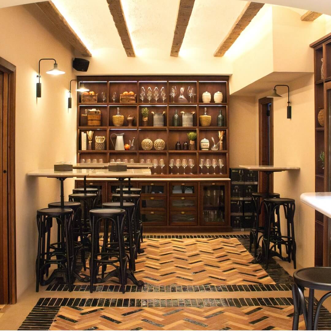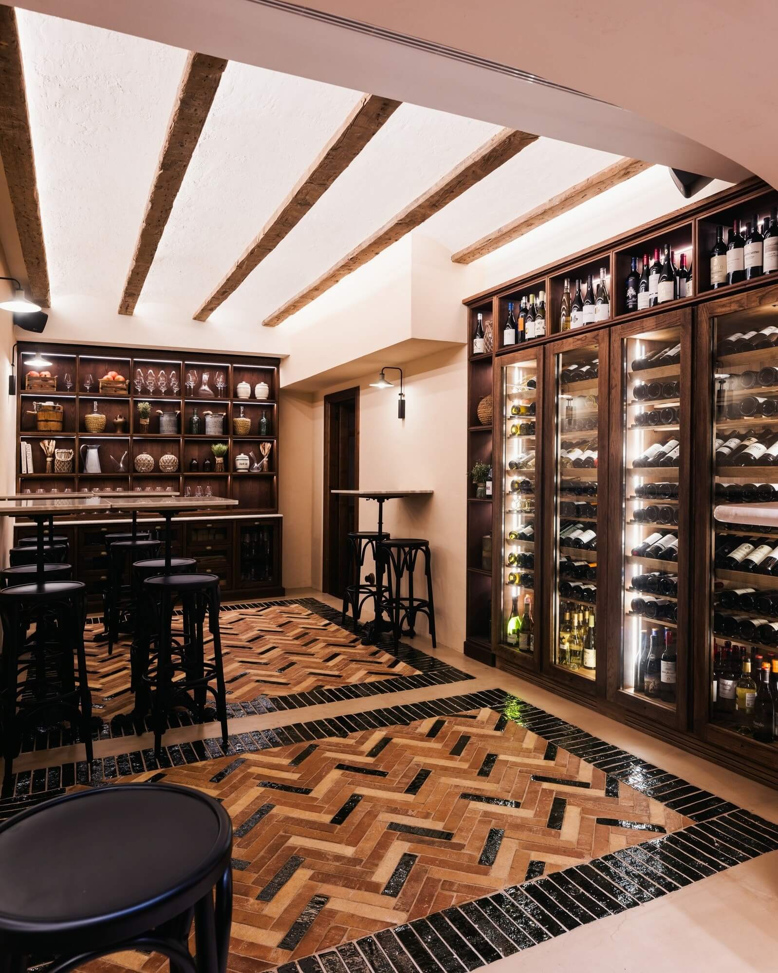 Con una capacidad aproximada de 400 botellas, la vinoteca ha sido diseñada para albergar una selección cuidada y representativa, combinando referencias de rotación para el servicio diario con vinos destinados a guarda y envejecimiento. La distribución interior prioriza la funcionalidad del equipo de sala, con botellas colocadas tumbadas y accesibles para coger por cápsula, y una zona inferior destinada a botellas en posición vertical, ideal para referencias especiales o formatos concretos.