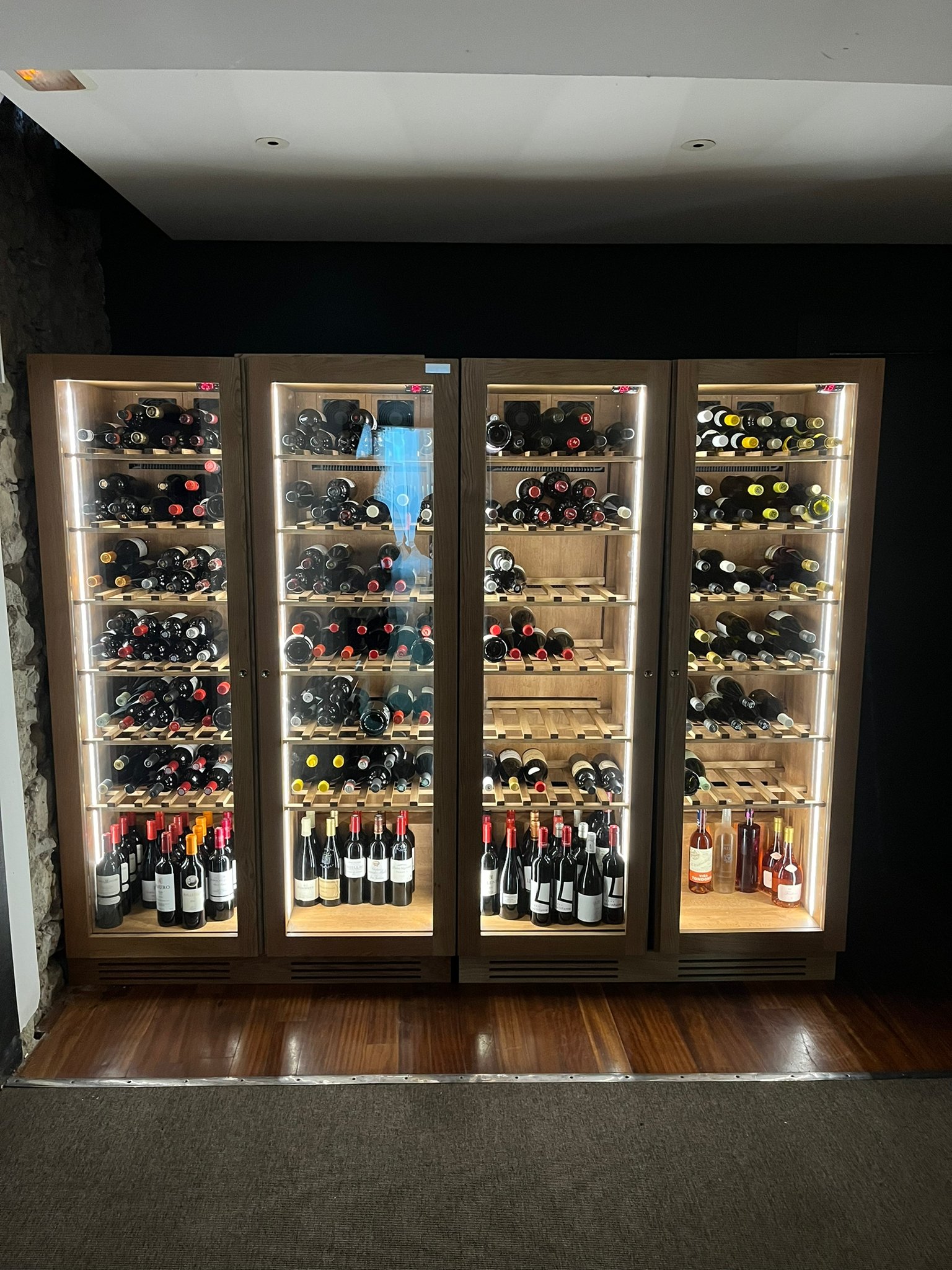 Se trata de una instalación de doble zona de temperatura, pensada para albergar aproximadamente 400 botellas, repartidas en zonas específicas para 200 vinos tintos y 200 vinos blancos. Cada zona cuenta con su propio sistema de climatización independiente, lo que permite mantener condiciones óptimas de conservación para tipos de vino diferentes, incluso en momentos de exigencia térmica.