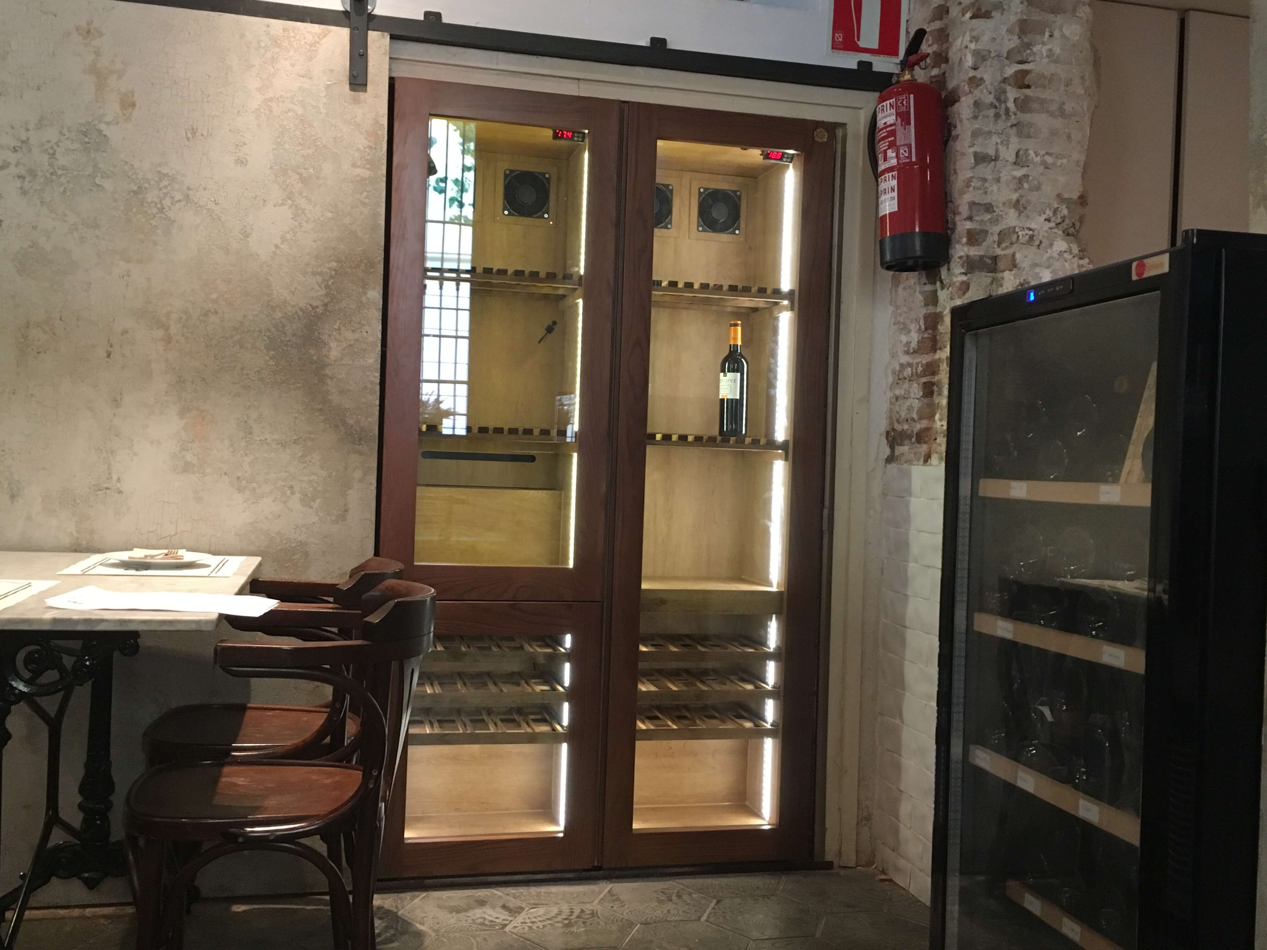 Bodega de doble puerta con estructura en madera natural y acabado artesanal, perfectamente integrada en el estilo cálido del local. Cuenta con iluminación interior LED que realza la presentación de los vinos, estantes de madera ranurada para correcta ventilación y conservación, y sistema de temperatura controlada visible (monotemperatura). Combina funcionalidad y estética, convirtiéndose en un punto focal elegante para el cliente.