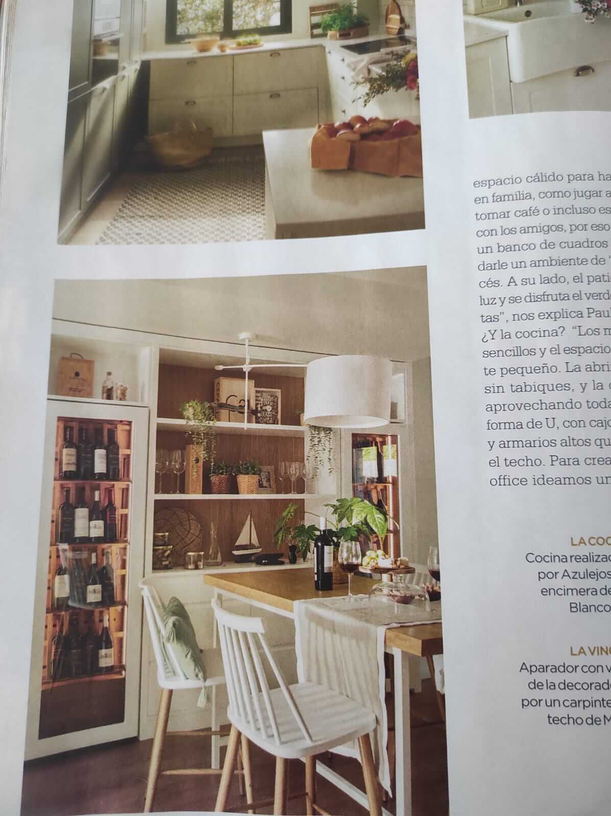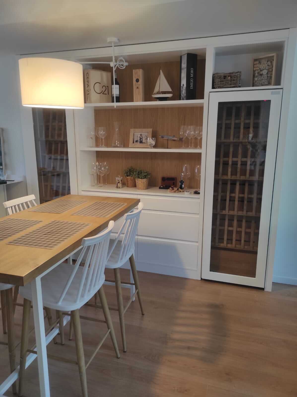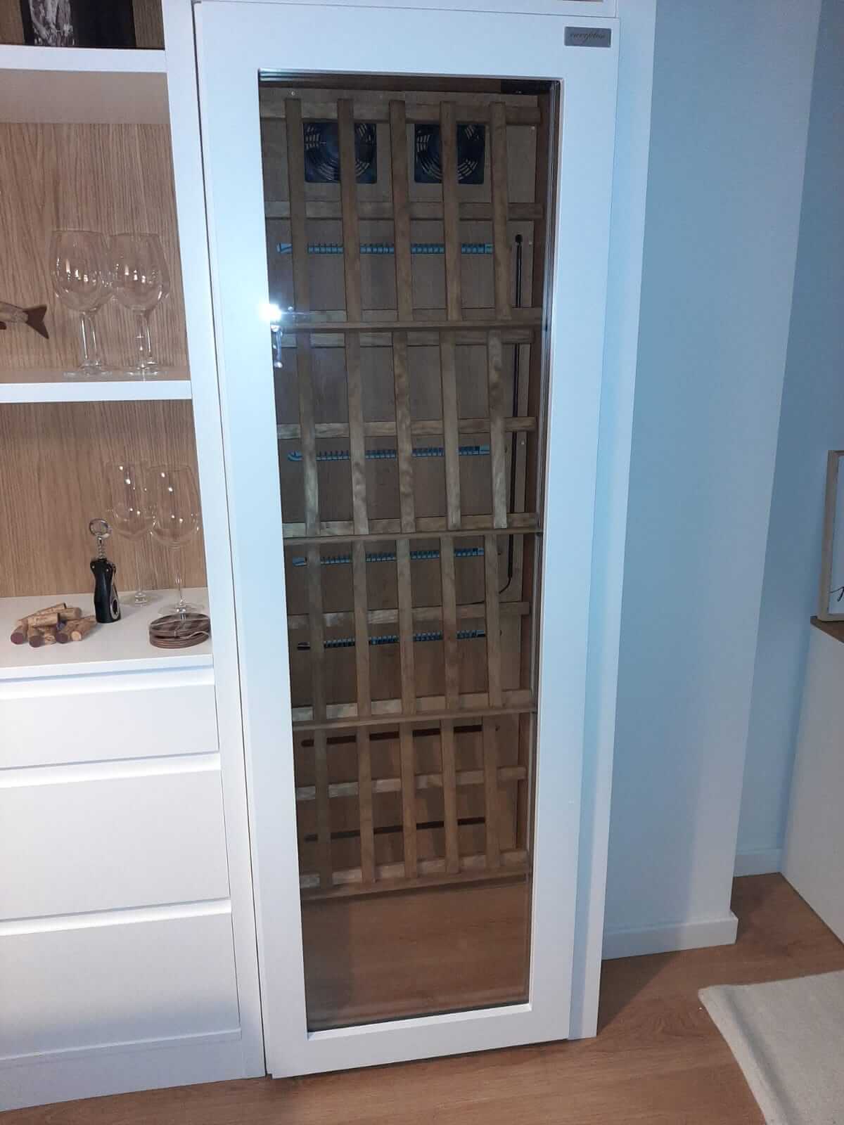 Ambas vinotecas están fabricadas en madera interior en color roble, combinada con un exterior lacado en blanco mate que se mimetiza con el resto del mobiliario de cocina y salón. Este equilibrio entre tonos claros y cálidos genera una sensación de continuidad visual y amplitud, convirtiendo la vinoteca en parte del mobiliario cotidiano del hogar.