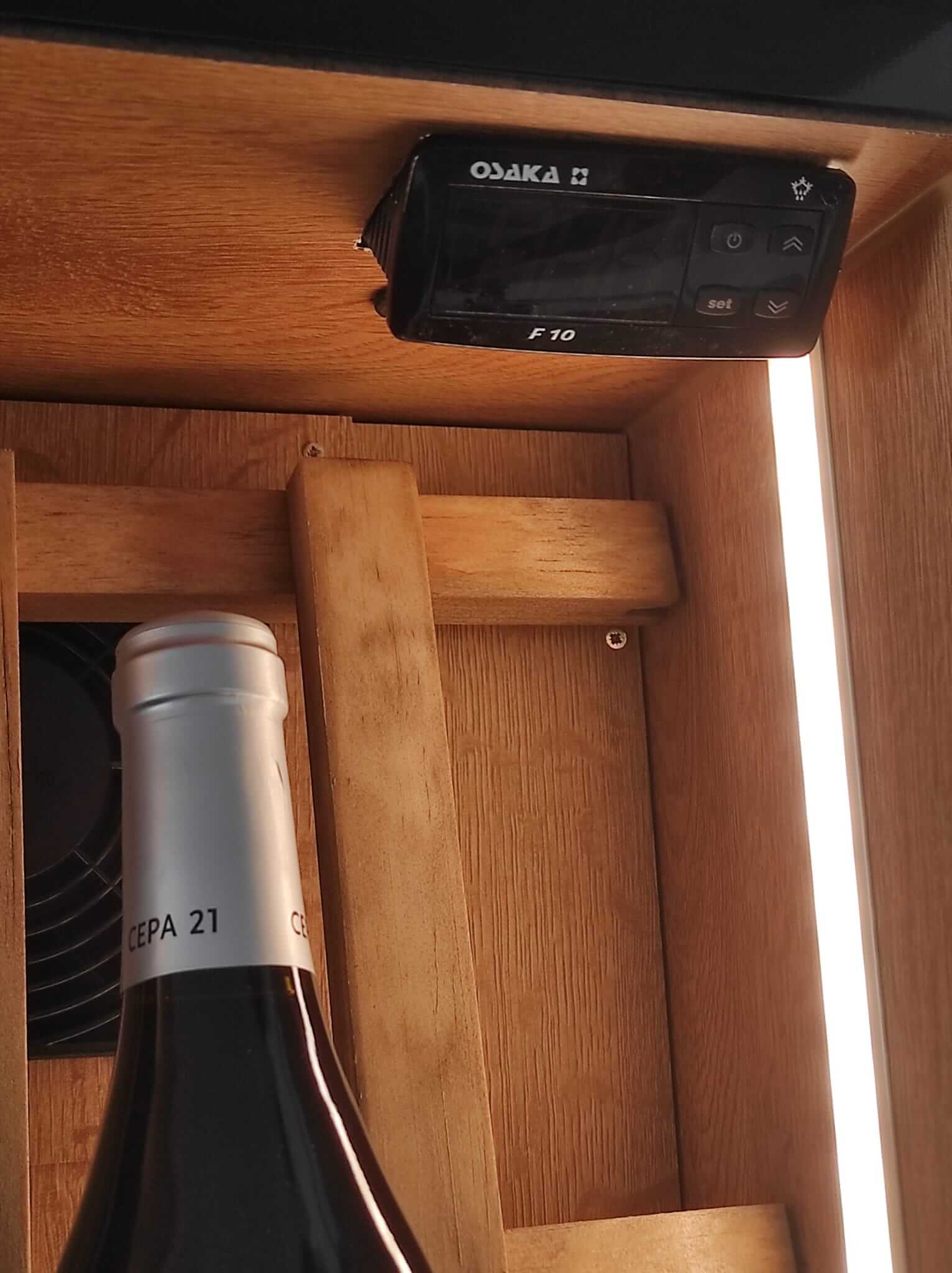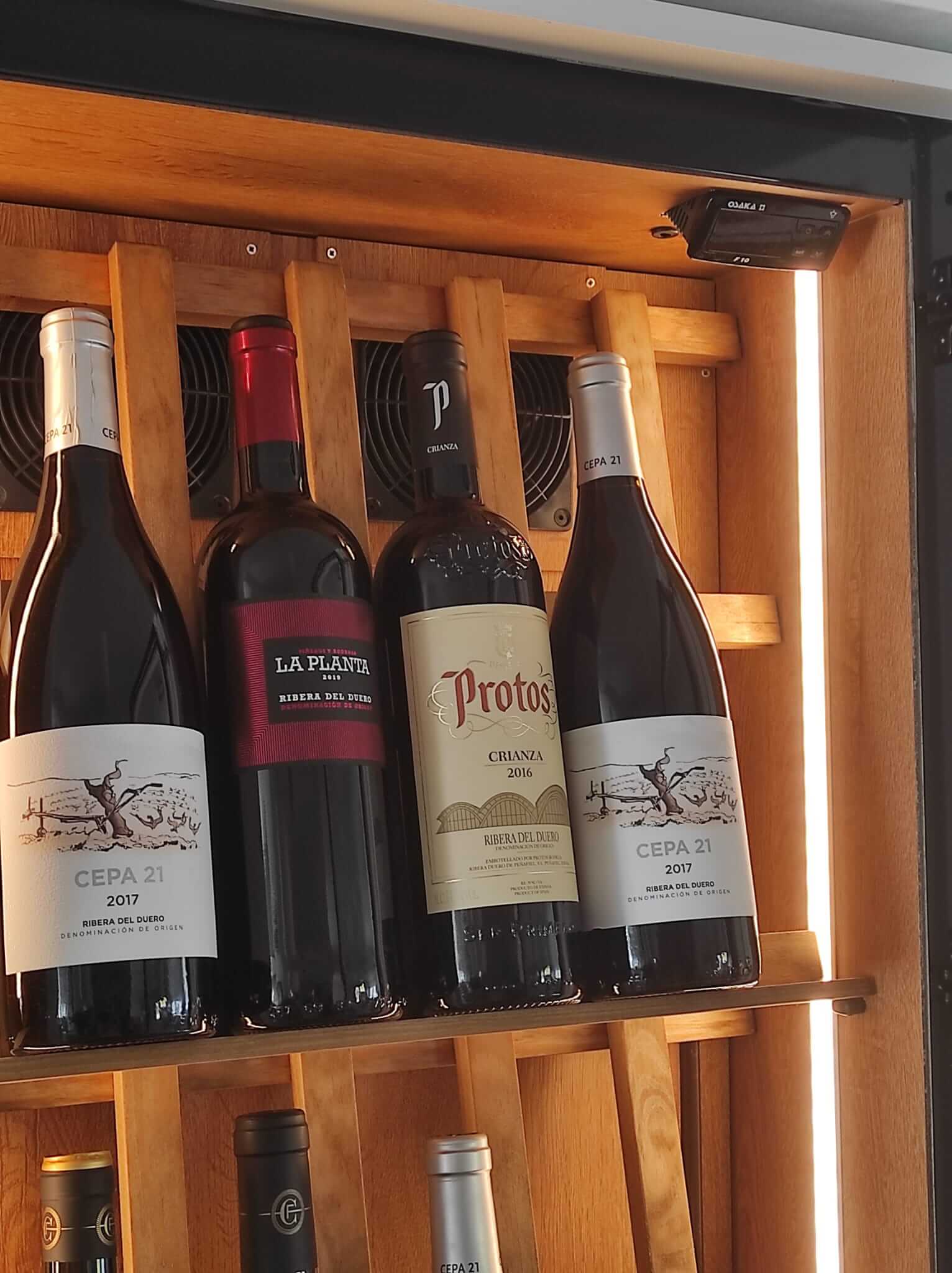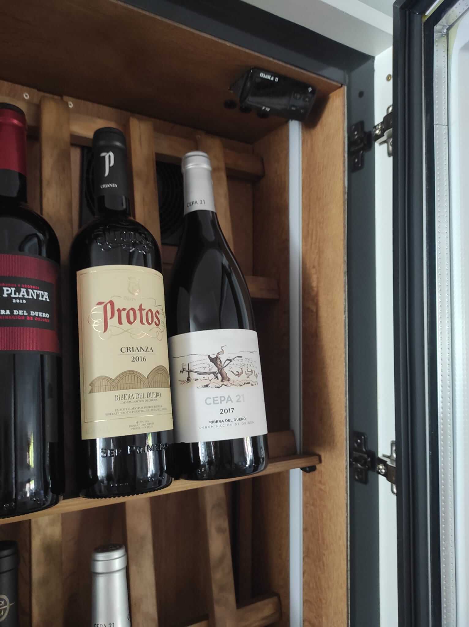 Cada unidad cuenta con bandejas de exposición semiinclinadas, diseñadas para mostrar las etiquetas de las botellas y facilitar su selección sin necesidad de manipularlas. Esta disposición, además de elegante, garantiza una conservación estable al mantener el corcho en contacto con el vino.