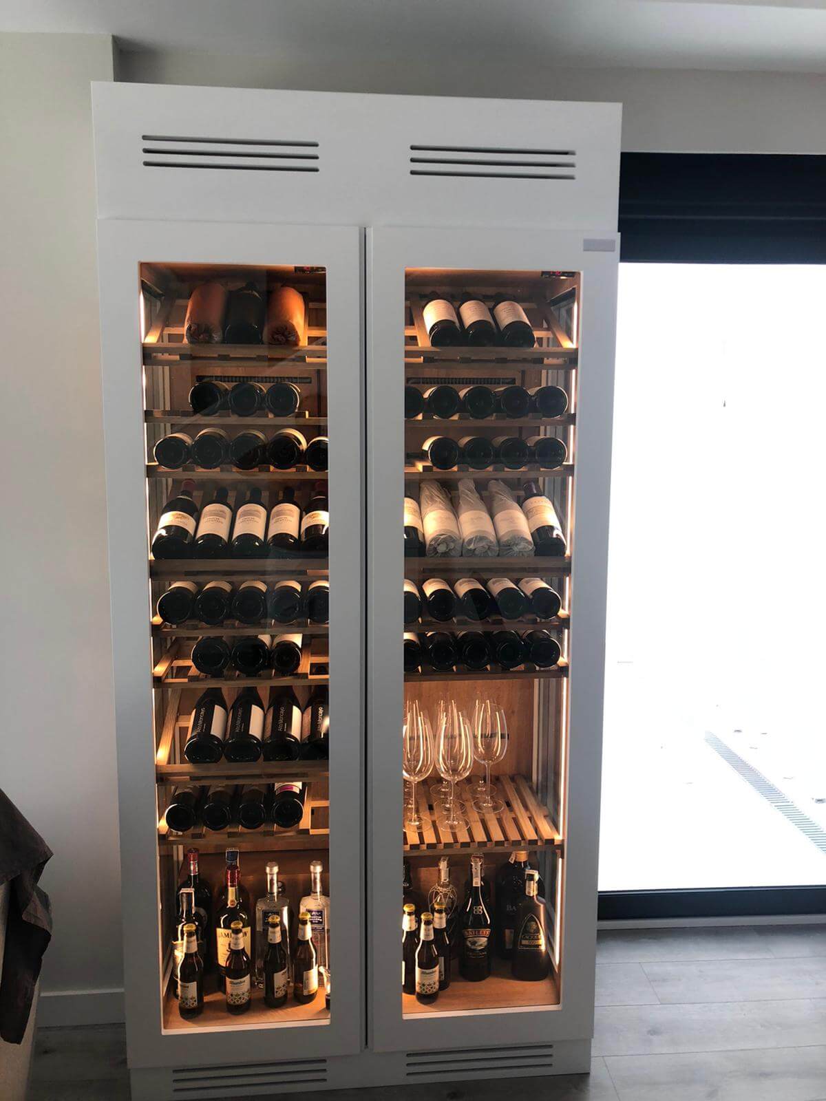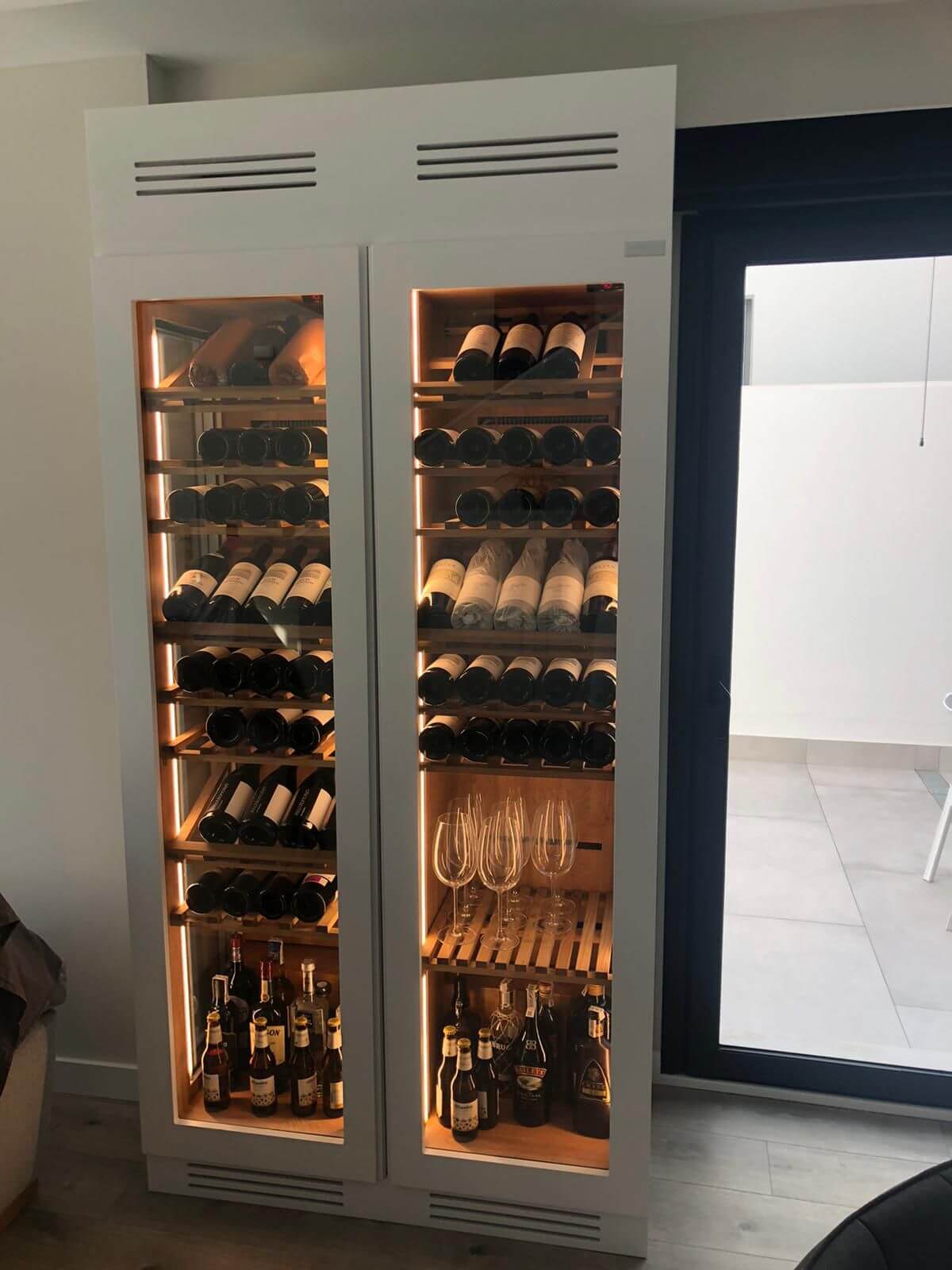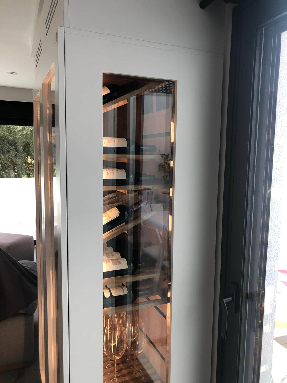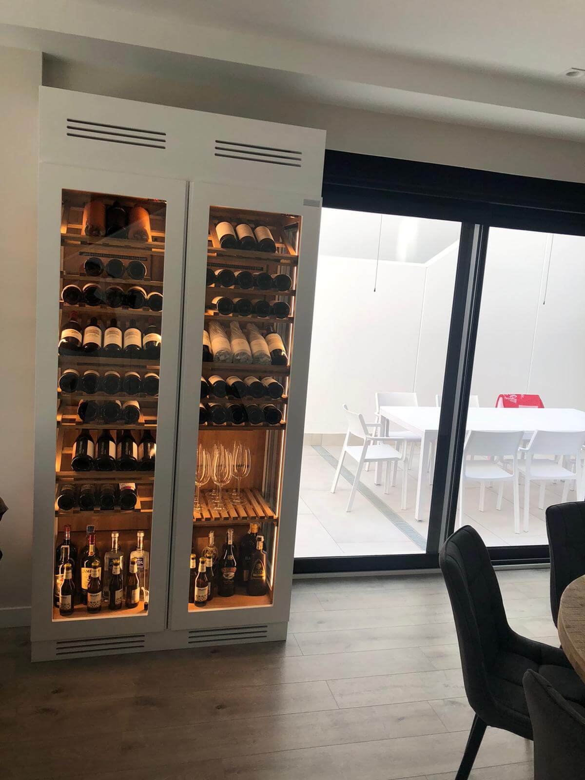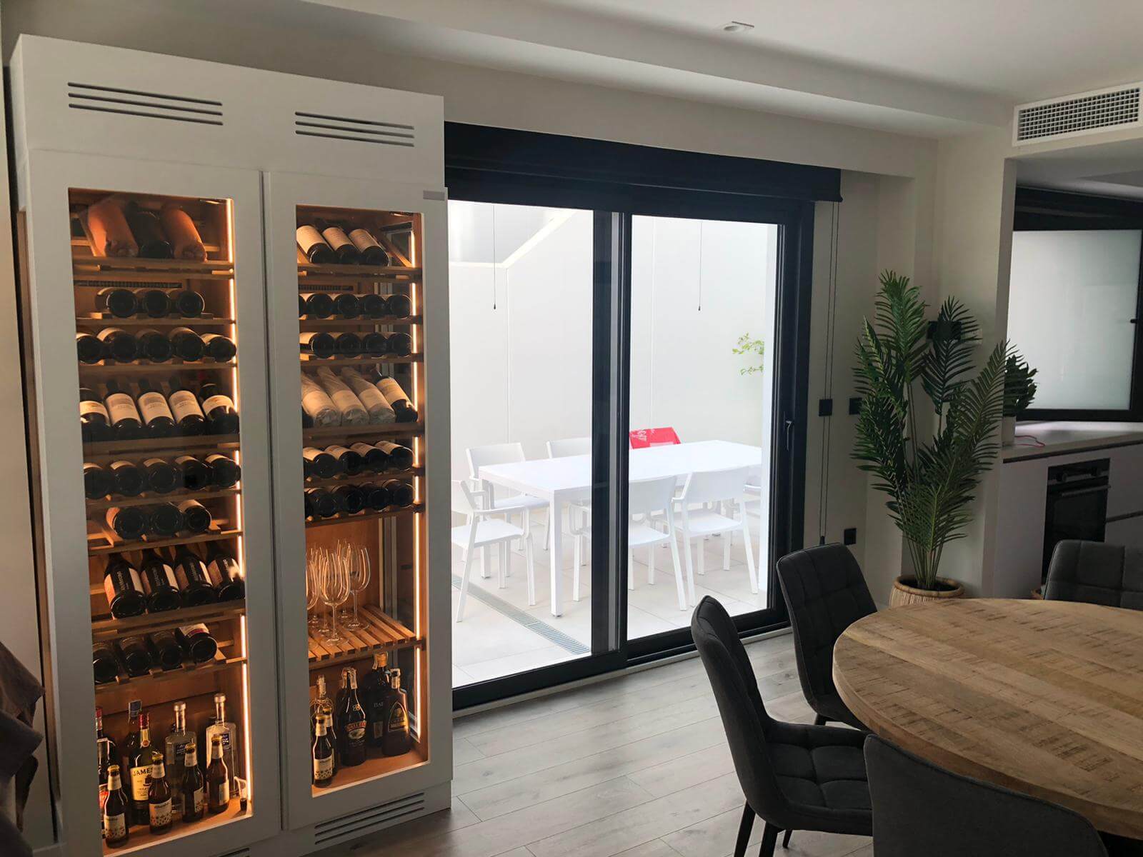 El proyecto destaca por su cristal lateral de visión panorámica, que permite disfrutar de la colección de vinos desde todos los ángulos, convirtiéndose en una pieza protagonista dentro del hogar. Su acabado en color blanco mate se integra a la perfección con la decoración de la vivienda, aportando modernidad y continuidad estética al ambiente.