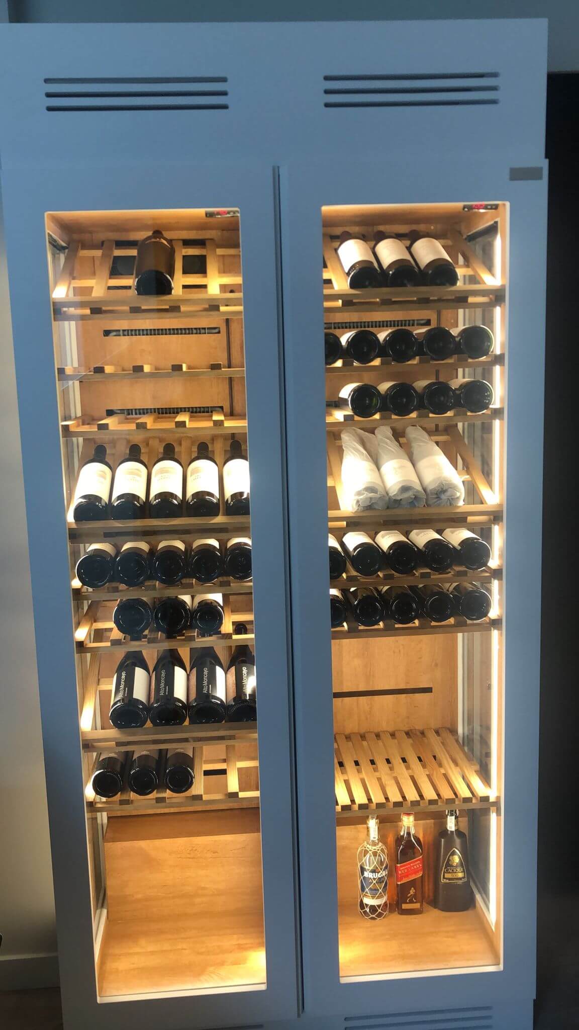 La retroluminación con luz cálida envuelve cada botella con una atmósfera elegante sin afectar a la conservación del vino, resaltando la belleza de las etiquetas y vistiendo el espacio con un toque único de distinción.