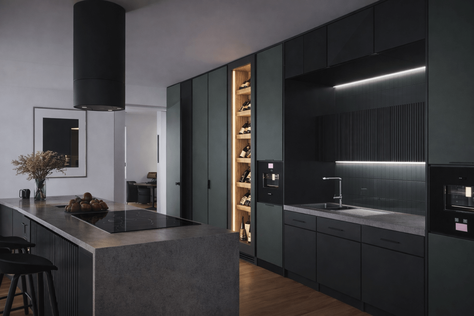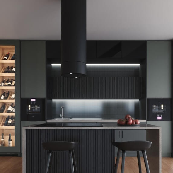 Desde el primer momento, el objetivo fue crear una vinoteca totalmente integrada en el mobiliario, respetando las líneas limpias y contemporáneas de la cocina, pero aportando un punto focal cálido y elegante. El exterior se resuelve con madera lacada en RAL 7024, un tono sofisticado que dialoga a la perfección con los acabados de la estancia, mientras que el interior en roble natural retroiluminado aporta profundidad visual y una sensación envolvente que realza cada botella.